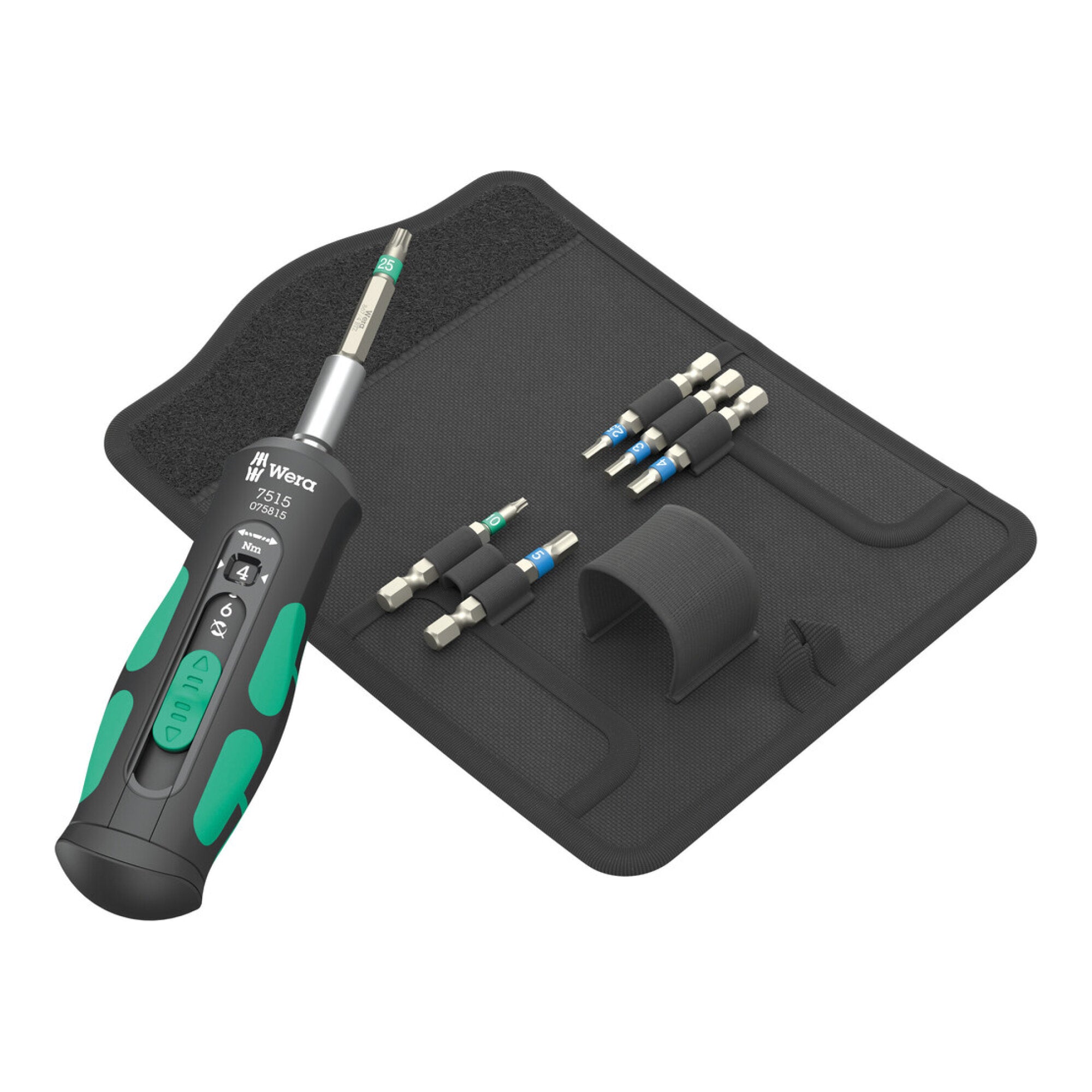 7-piece tool set. For professional screwdriving/professional fine adjustment AND for torque-controlled screwdriving. Secure slip-over torque mechanism with quick clockwise/counterclockwise setting and five selectable tightening torques (2.0; 3.0; 4.0; 5.0; 6.0 Nm) and one fixed position (Torque Lock) for unlimited loosening and tightening moments. Quick-release holder for high robustness. Ideal for bike operations. Suitable for bits with 1/4" external hexagon drive. 6 tough bits (50 mm length), profile and size of the bits are easily recognized thanks to the Wera Take it easy Tool finder with its colour codes and labels.