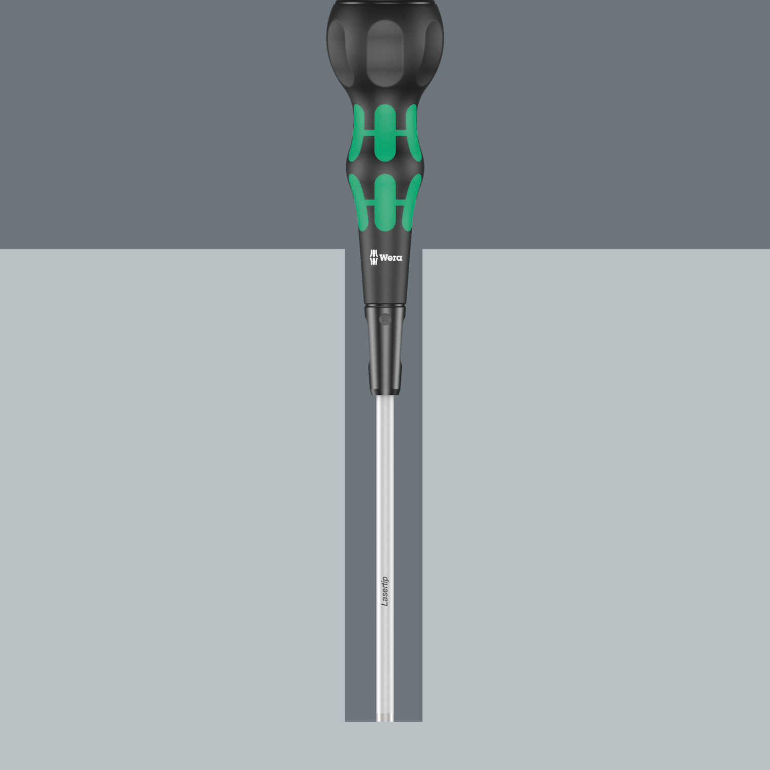 A precisely focused laser creates a sharp-edged surface structure. Wera Lasertip 'bites' itself into the screw head and prevents any slips out of the recess. It is compatible with screwdrivers for slotted, Philips and Pozidriv screws.