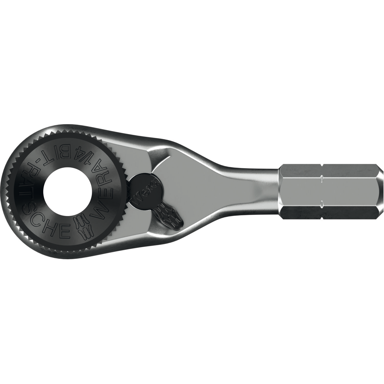 Wera bit ratchet for bitholding screwdrivers with 1/4" mounting. Easiest operation, even with just one hand, in cramped screwdriving applications. Drop-forged solid steel design. Fine toothing mechanism with 60 teeth allows for a low return angle of 6° for precise working. The knurl allows fast screwdriving in cramped situations when there is no space for the ratchet. Easy clockwise/counterclockwise switching. Ergonomically shaped ratchet head for 1/4" hex drive bits and, using an adapter, also for 1/4" sockets and bit sockets.