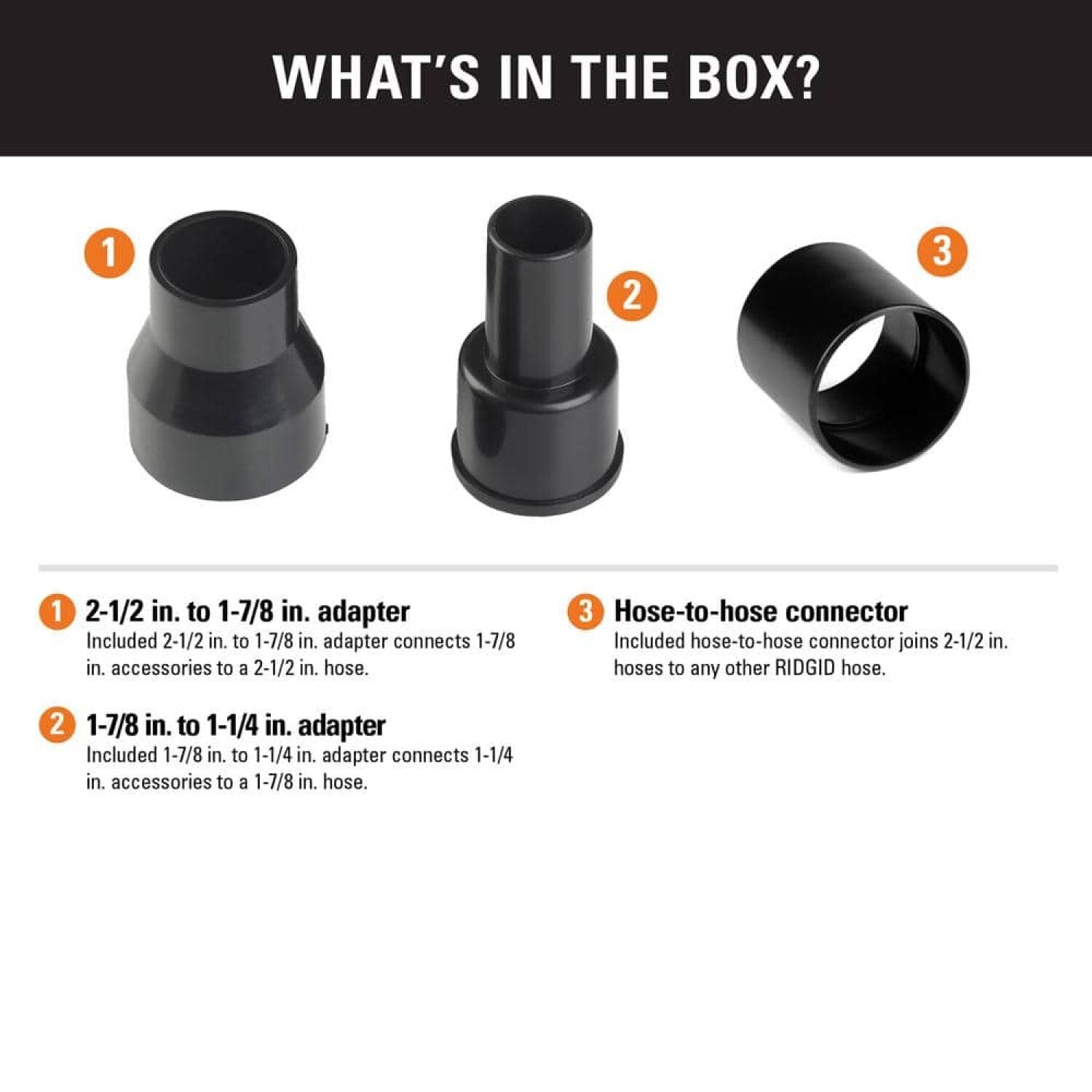 The RIDGID VT1755 (31743) 3-Piece Hose Adapter Kit for Wet/Dry Vacuums is designed to connect different sizes of vacuum hose, wands, and accessories. The 2 1/2 in. to 1 7/8 in. Adapter connects 1 7/8 in. accessories to a2 1/2 in. hose, while the 1 7/8 in. to 1 1/4 in. Adapter connects 1 1/4 in. accessories to a 1 7/8 in. hose. The Hose-to-Hose Connector joins two 2 1/2 in. hoses at the ends to provide extended reach. In addition, the 2 1/2 in. Adapter and 1 7/8 in. Adapter can be combined to connect 1 1/4 in. accessories to a 2 1/2 in. hose.