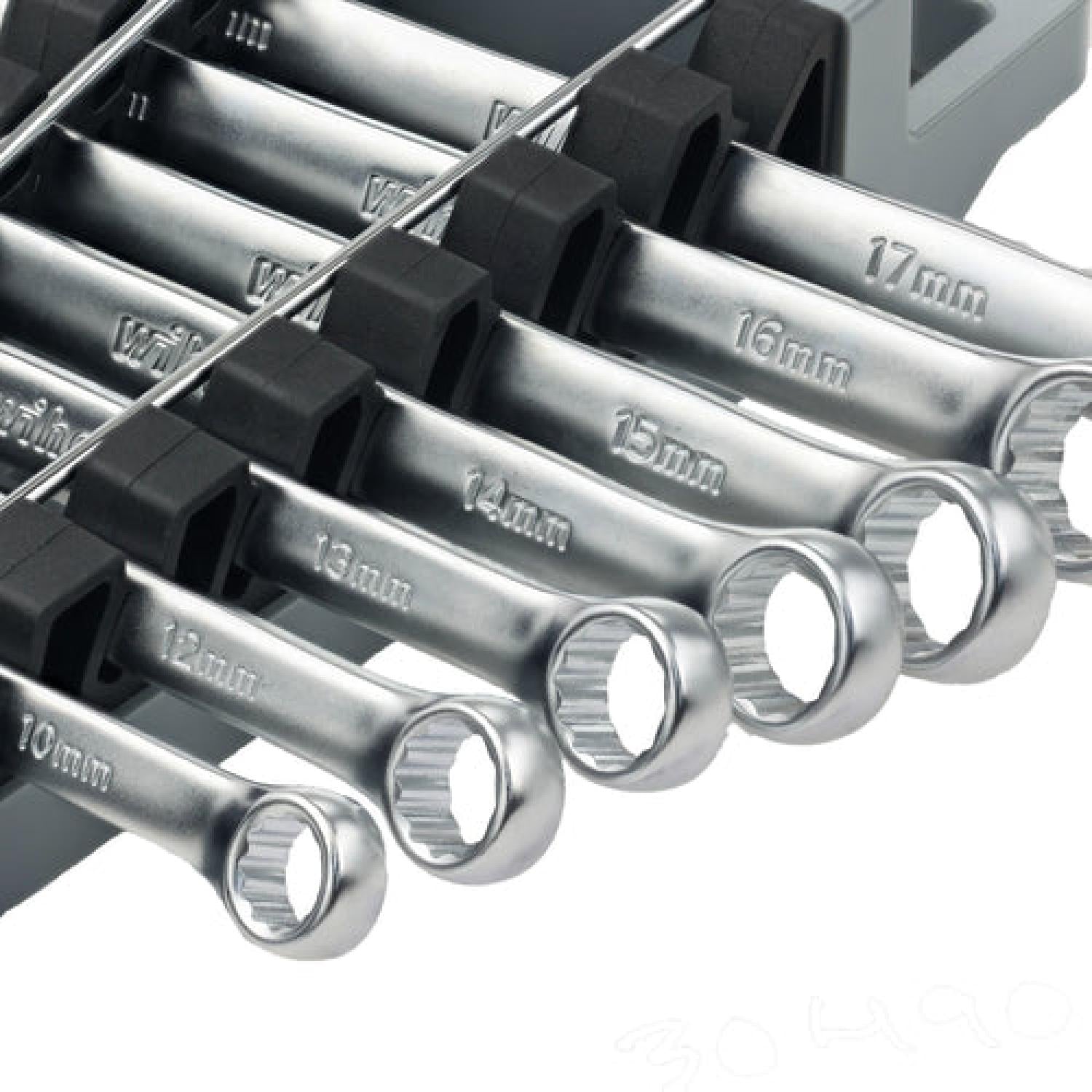 Wiha's Combination Wrenches have a 12-point box-end design with contact points that apply force to the flat sides of the fastener head—rather than the corners—to prevent the fastener head from rounding off. The open-end is angled 15 degrees for flipping the wrench between rotations to maximize rotations and the box-end offset 15 degrees for finger clearance and working around obstructions that limit access to the fastener. The wrenches consist of premium-quality tool steel, have a Chrome-plated satin finish for corrosion protection, and the size profiles are boldly stamped on the handle for easy identification. The tools come conveniently stored in a soft grip rack for secure, space-saving storage. Wiha Combination Wrenches are backed by the Wiha No Hassle Guarantee.