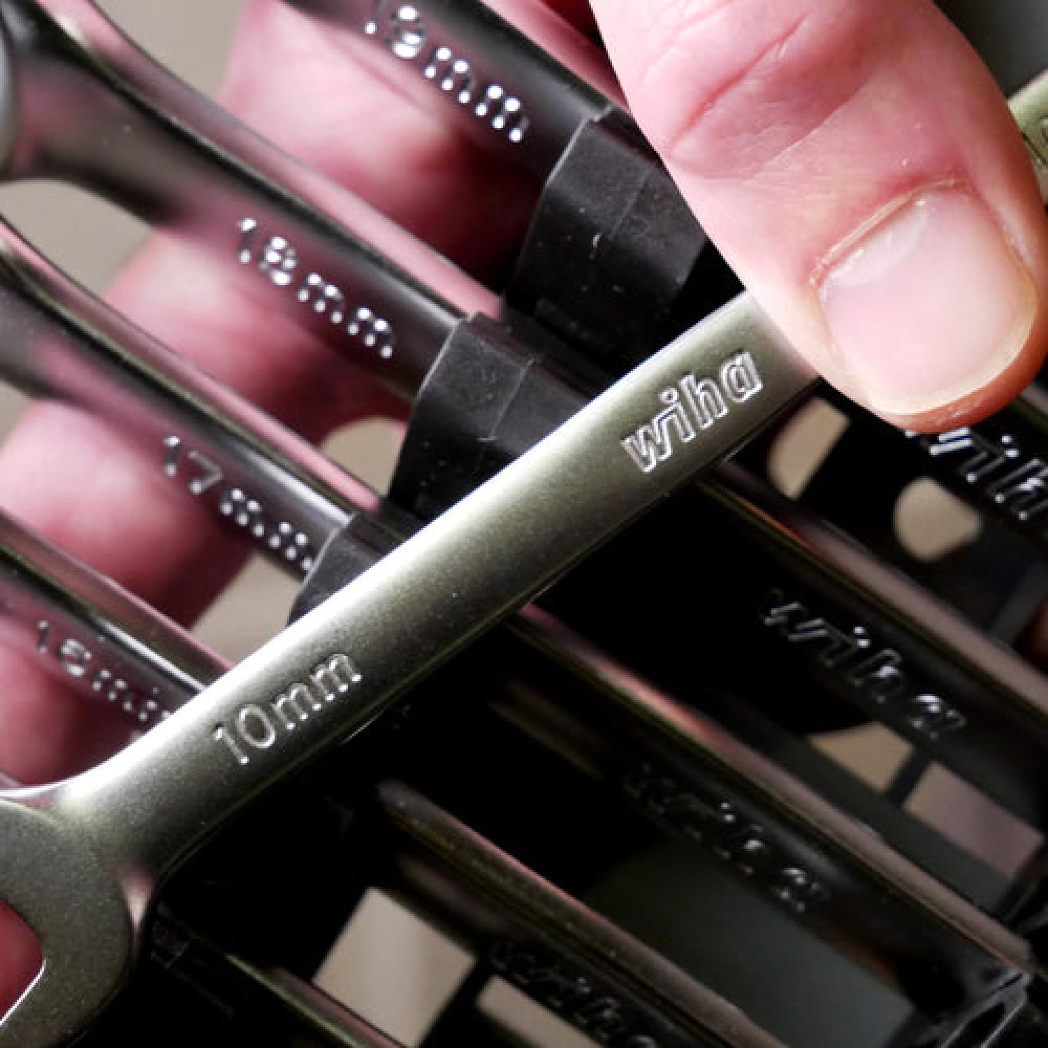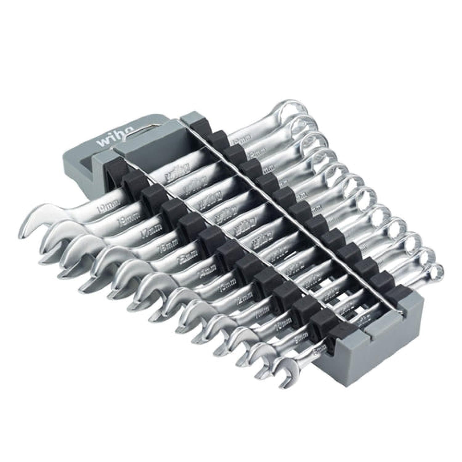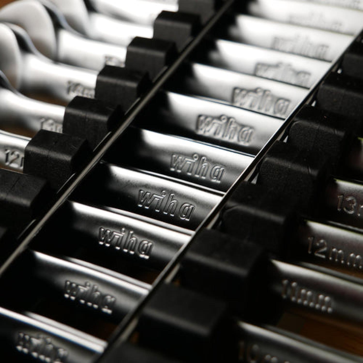 Wiha's Combination Wrenches have a 12-point box-end design with contact points that apply force to the flat sides of the fastener head—rather than the corners—to prevent the fastener head from rounding off. The open-end is angled 15 degrees for flipping the wrench between rotations to maximize rotations and the box-end offset 15 degrees for finger clearance and working around obstructions that limit access to the fastener. The wrenches consist of premium-quality tool steel, have a Chrome-plated satin finish for corrosion protection, and the size profiles are boldly stamped on the handle for easy identification. The tools come conveniently stored in a soft grip rack for secure, space-saving storage. Wiha Combination Wrenches are backed by the Wiha No Hassle Guarantee.