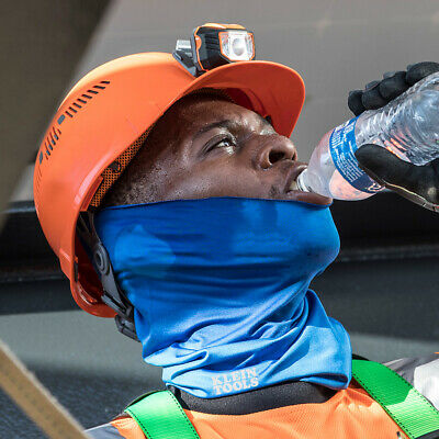 Klein Tool's Neck and Face Cooling Band can be worn wet or dry and has UPF 50+ protection. Cooling is immediate after getting wet and will last for hours. This cooling band is made with super evaporative performance knit fabric. Anti-odor treatment provides long lasting freshness. Wear under a hard hat or alone.