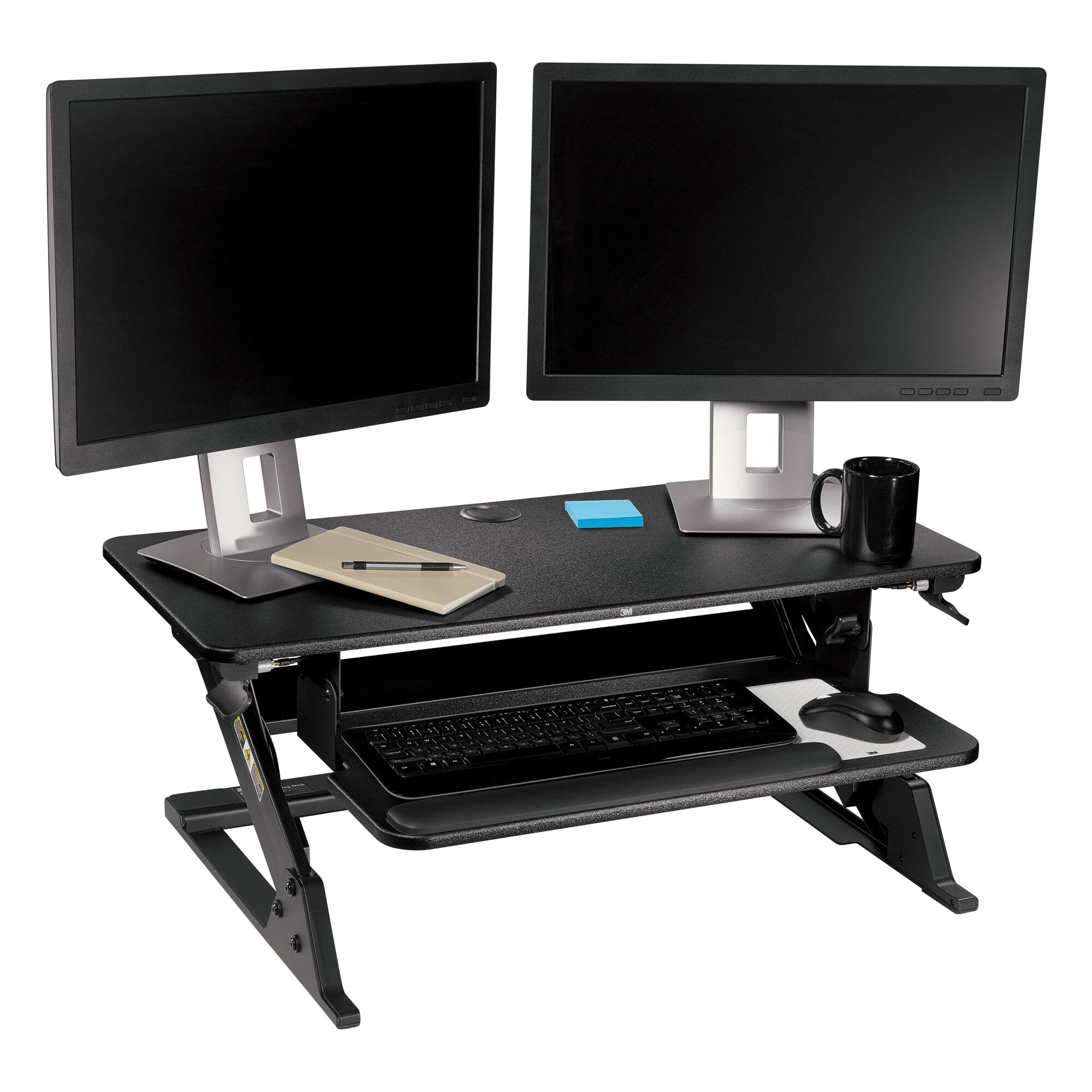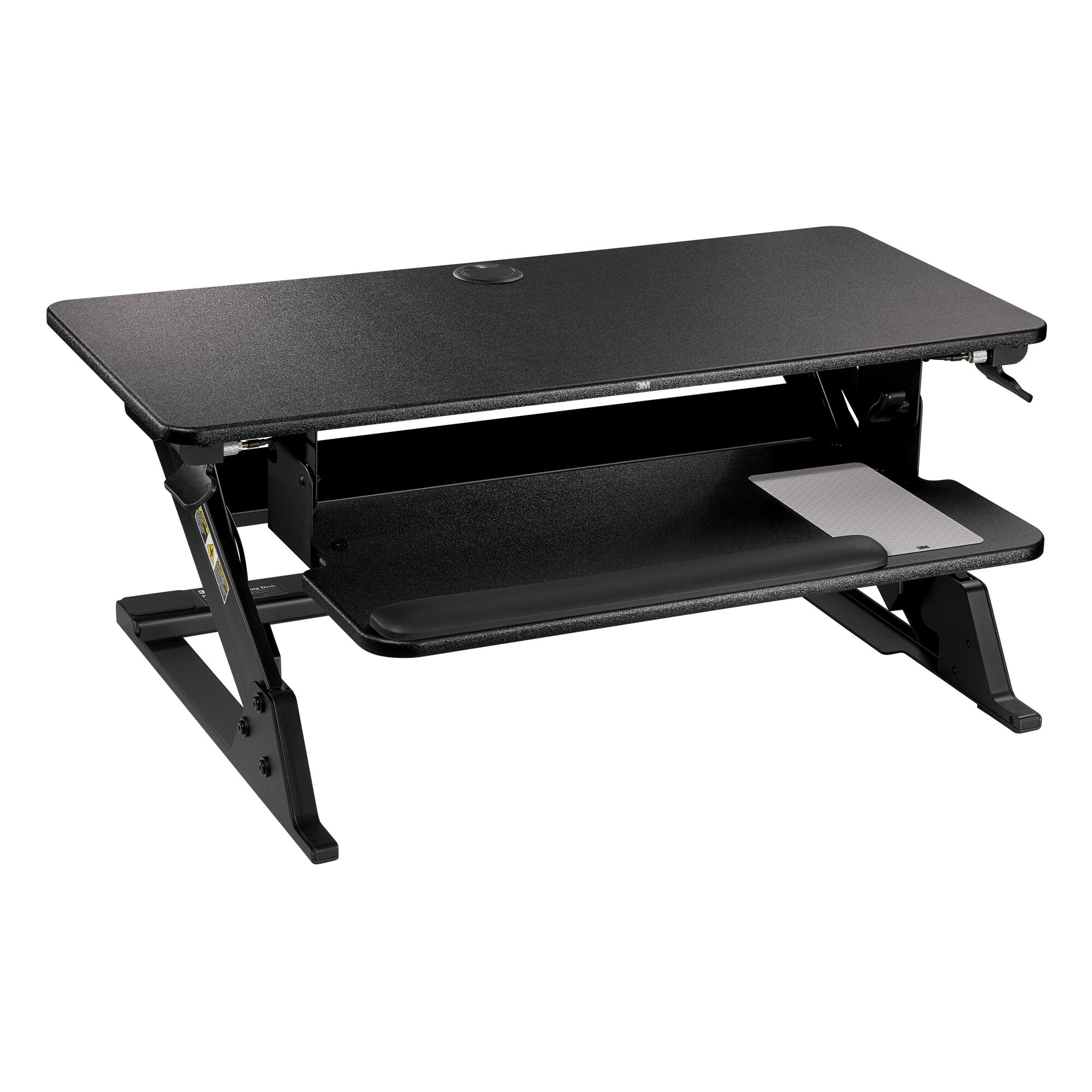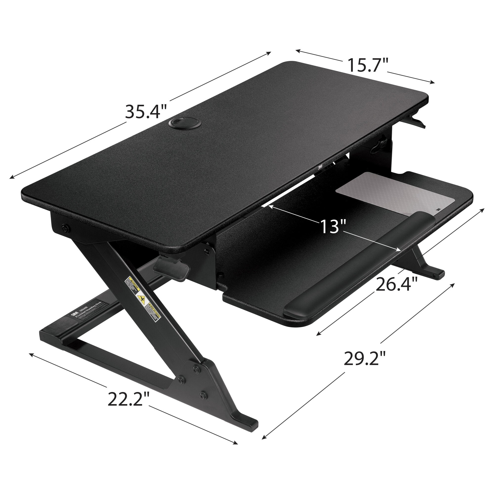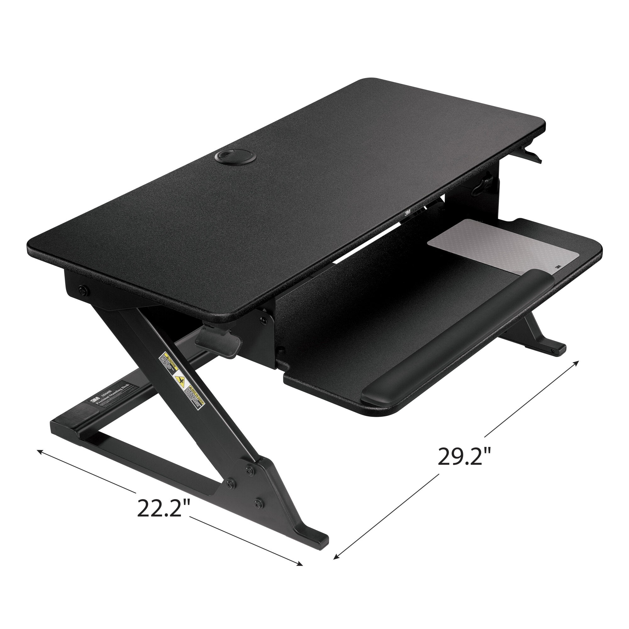 3M Precision Standing Desk, Converts Desktop to Sit-Stand Workstation, 29 in x 22.2 in Footprint, Fits 24 in Deep Desk, Includes Accessories, Black (SD60B)When it comes to standing comfort, small adjustments can make a big difference! The 3M Precision Standing Desk provides maximum adjustability to achieve your most comfortable standing work position. Side-mounted levers controlling gas assist height change technology allows for continuous height settings from 6.2” to 20” above the desk surface. The keyboard surface has tilt adjustment range of -10◦/+10◦ to help achieve most comfortable typing position. The 3M Precision Standing Desk also includes a 3M Gel Wrist Rest and Precise Mouse Pad for added comfort and productivity.