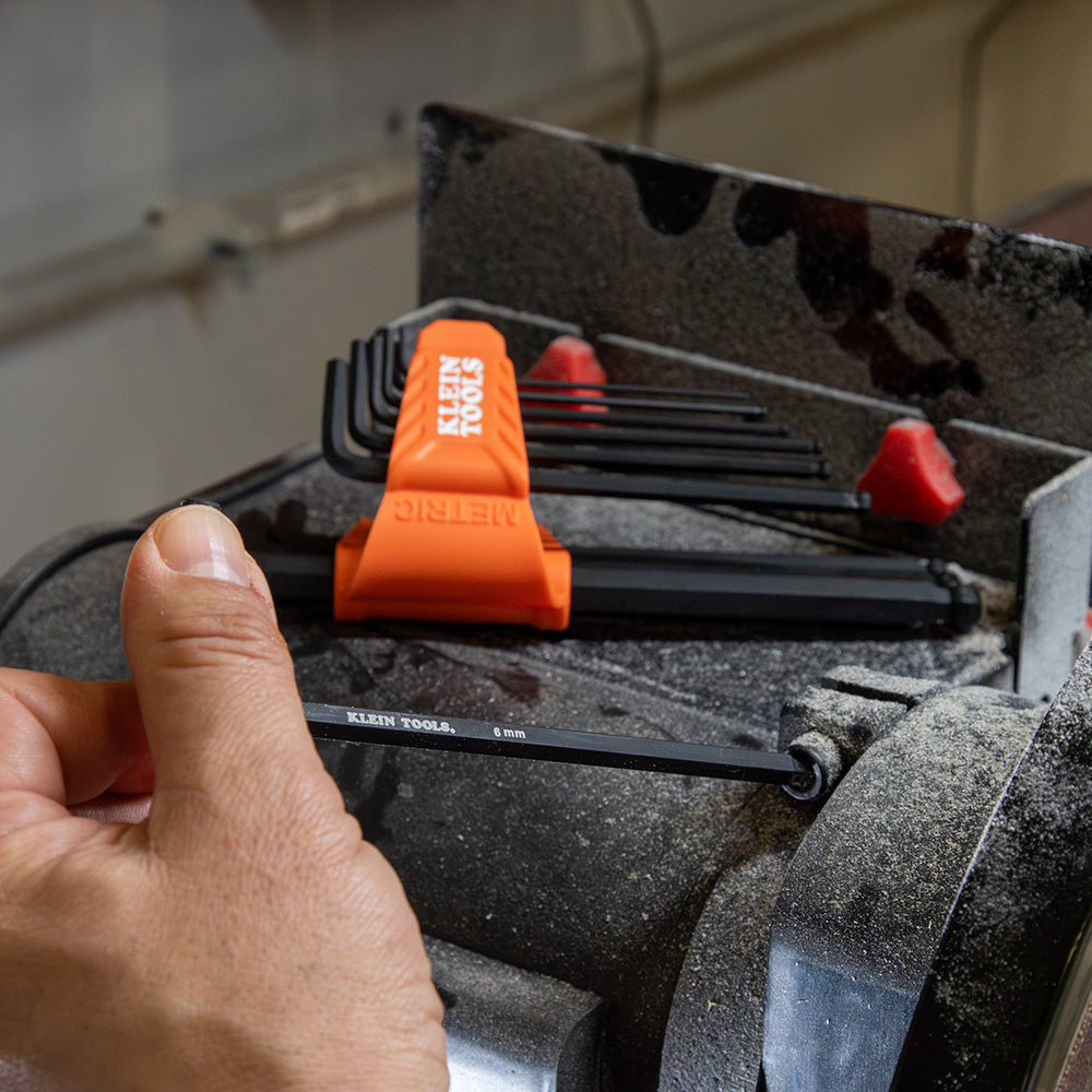 Klein Tools' 10-Key Ball-End Hex Key Set conveniently consolidates the most popular metric sizes into one compact case. The industrial strength, extended reach ball-end keys are optimal for working at angles up to 25 degrees. The secure storage case features an internal locking mechanism to prevent loss of keys.