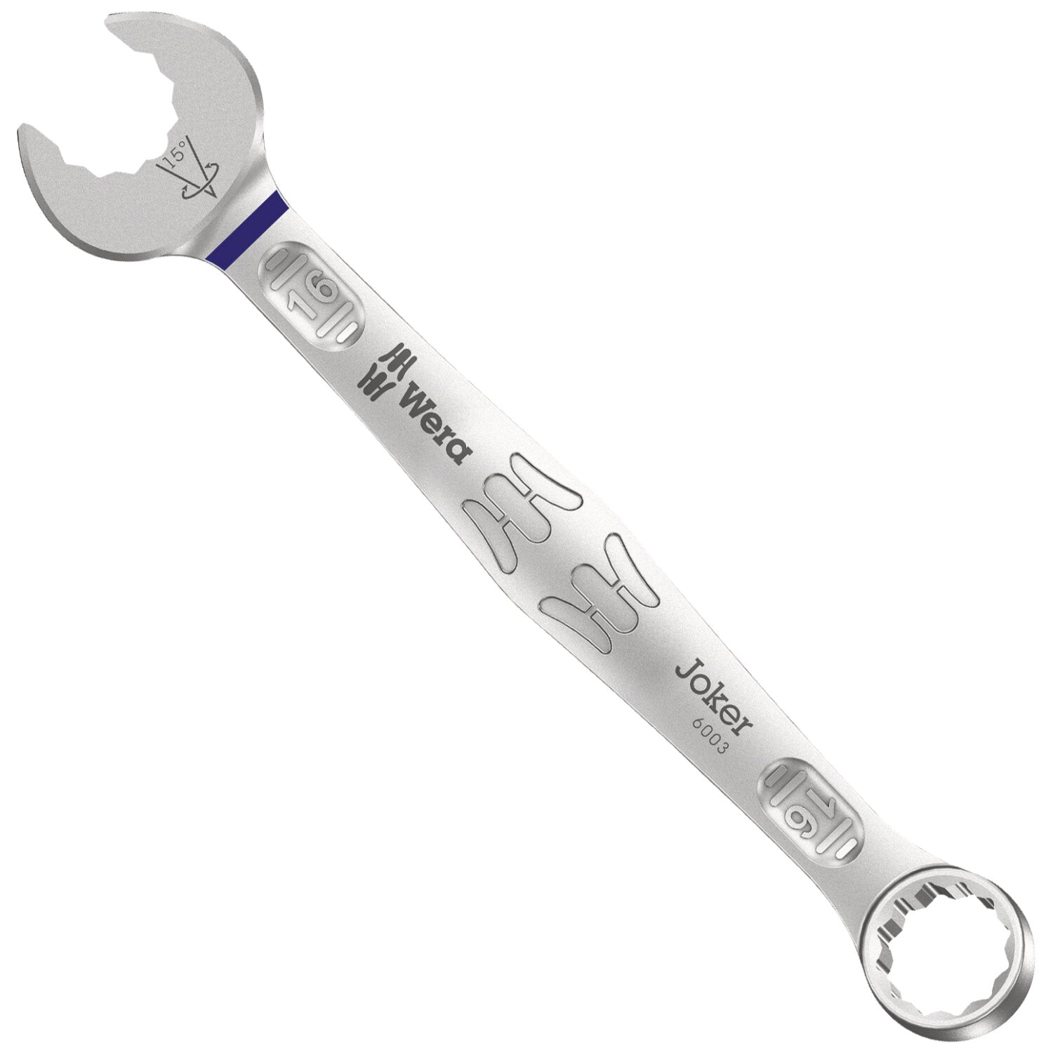 As the installation space becomes increasingly tight during screwdriving, tools are necessary that enable users to work successfully even in such situations. Narrow spaces require additional placement points of the tool. Can spanners be modified so that the placement possibilities of the tool increase? The combination of the 7.5° pivoted mouth and the double hexagon geometry doubles the placement points. A repeated 180° turn of the wrench around the longitudinal axis during screwdriving provides four placement possibilities, and bolts or screw heads can be engaged every 15°. The Joker 6003 with its smart mouth geometry significantly expands the range of uses in confined spaces. The Joker 6003 will automatically find the respective placement point after every turn. The slim yet robust ring side is angled by 15° to the tool axis. The high-quality surface treatment achieves a high and long-lasting corrosion protection. With tool finder "Take it easy": colour coding by size.