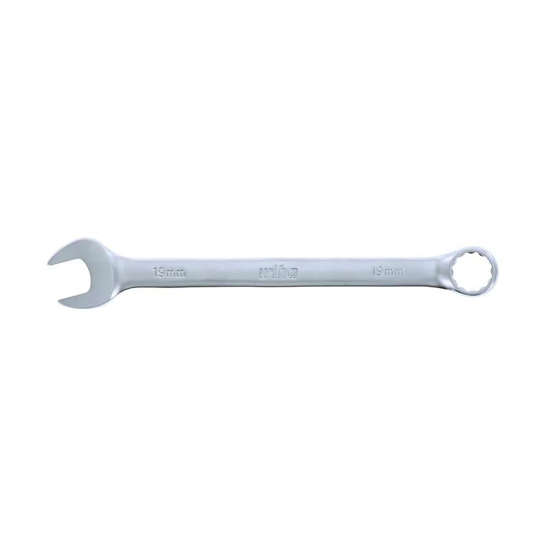 Wiha's Combination Wrenches feature a 12-point box-end design doubles access-angles of a 6-point opening. The point-contacts apply force to the flat sides of the fastener head—rather than the corners—to prevent the fastener head from rounding off. The open-end is angled 15 degrees for flipping the wrench between rotations to maximize rotations and the box-end offset 15 degrees for finger clearance and working around obstructions that limit access to the fastener. The wrenches consist of premium-quality tool steel, have a Chrome-plated satin finish for corrosion protection, and the size profiles are boldly stamped on the handle for easy identification. Wiha Combination Wrench is backed by the Wiha No Hassle Guarantee.