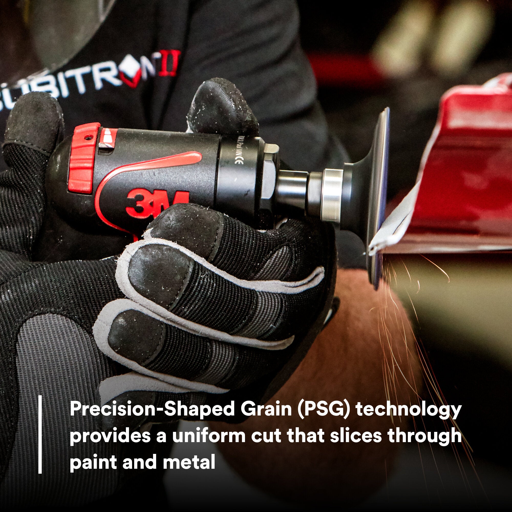 3M™ Cubitron™ II abrasive discs, cutoff wheels and file belts have raised the bar for high-performing abrasives. Cubitron™ abrasives feature our Precision-Shaped Grain (PSG) technology, which allows our engineers to control the geometry of the abrasive grain for a truly fast, efficient cut. Instead of simply crushing the abrasive into particles, 3M uses microreplication to uniformly size ceramic grains and precisely shape them into triangular structures – essentially, sharp peaks that slice, not plow, through paint and metal. These grains are electrostatically oriented on the abrasive surface for the most efficient cut and even wear. What’s more, PSG fractures during use to maintain sharp abrasive edges. The result: Cubitron™ II cuts 30% faster and lasts 2x longer than conventional ceramic abrasives.