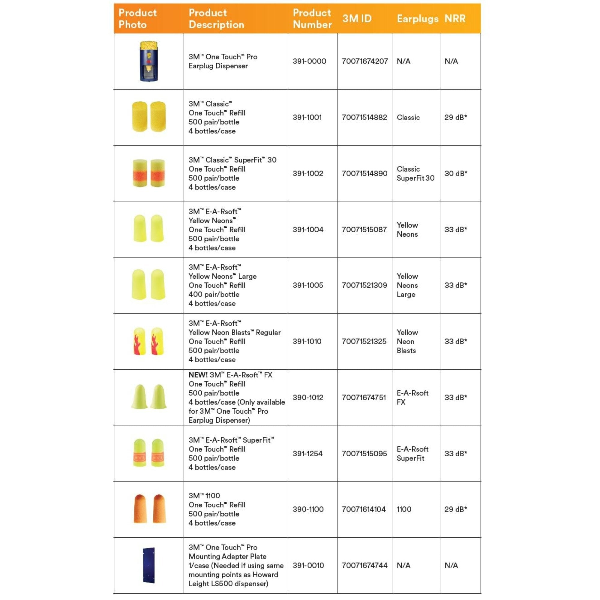3M One Touch Pro Earplug Dispenser gives workers convenient access to hearing protection products. A "No-Waste Funnel" accurately delivers earplugs with a slight turn. It typically dispenses a single earplug with each turn, giving the worker more control with less chance of spillage and waste of earplugs.3M™ One Touch™ Pro Earplug Dispenser makes it easy for workers to get the earplugs they need on the job. The dispenser holds 400 500 pair of earplugs that are dispensed one at a time. A simple turning motion drops an earplug into the worker's hand. Because the dispensing of earplugs is controlled, there should be little waste. Our dispenser also makes it more sanitary for workers to get their earplugs. It eliminates the practice of workers reaching into a bin and touching multiple earplugs while taking the ones they need. This feature is especially important considering that workplace hands are often soiled with various contaminants.
