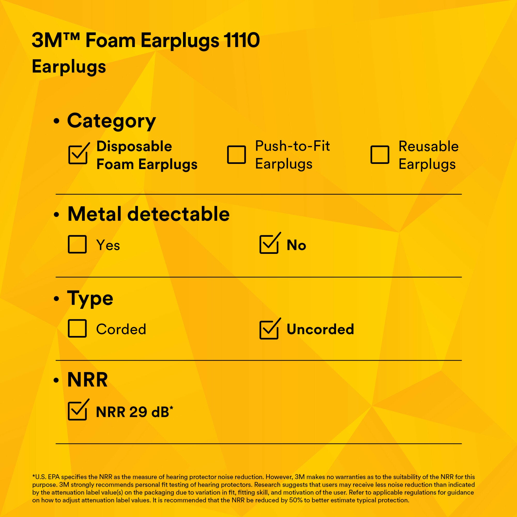 3M 1100 Earplugs are made with soft foam and a tapered design to help provide a noise blocking seal. These earplugs are easy to roll down and insert, with the foam softening with body temperature to improve comfort over extended use. One size fits most.Slow recovery foam gives the user time to get the compressed foam cylinder (rolled down earplug) into the ear before the foam fully expands to fill the ear canal. Available with or without cords to suit user preference. Dispenser packaging option available. This product is EARfit testable to help validate the level of protection the individual user is getting.