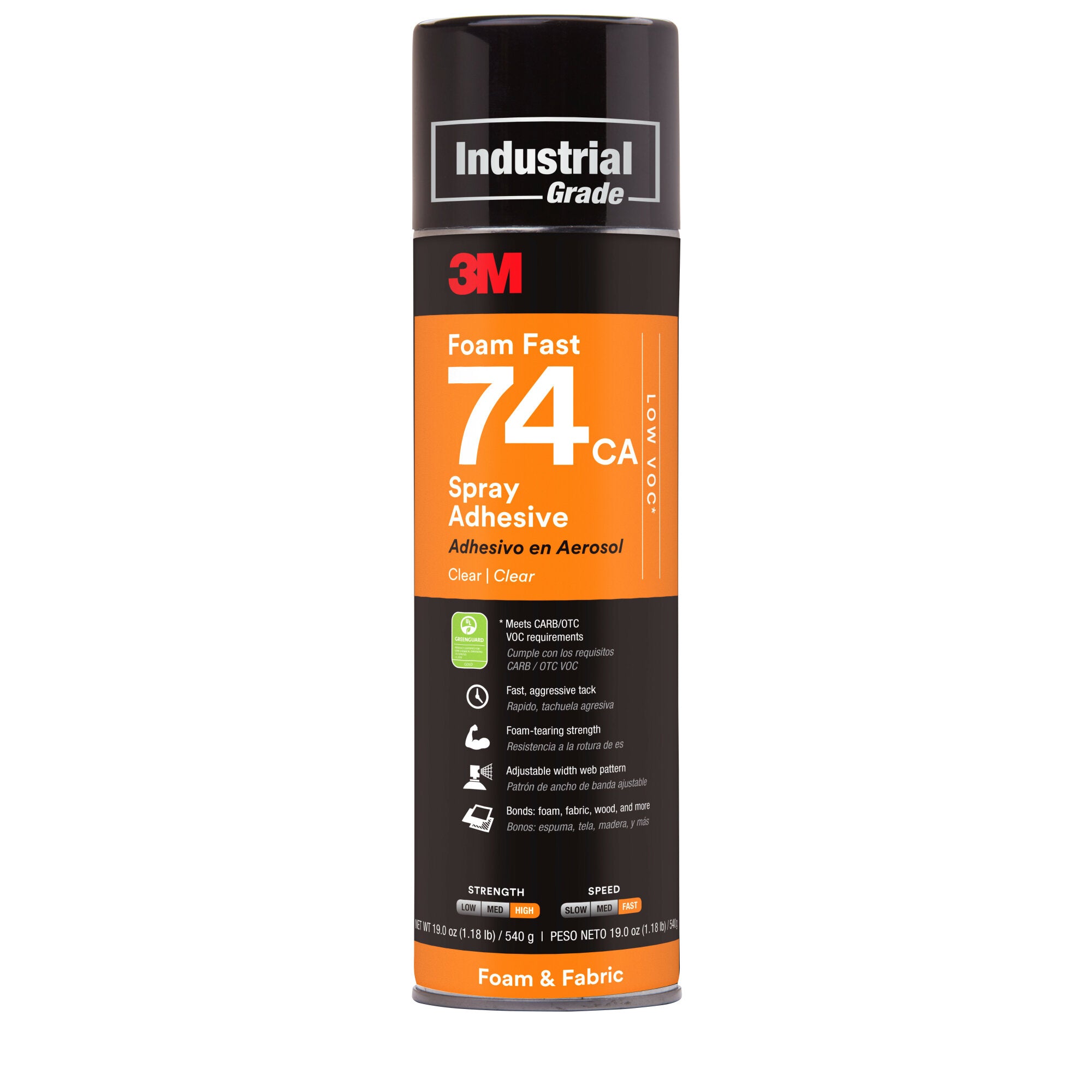 3M Foam Fast 74 CA Orange Spray Adhesive - Low VOC <25% is a fast-drying spray adhesive that bonds foam and fabric to a wide range of substrates. The permanent bond provides fast results to keep projects moving ahead, with a non-yellowing formula that dispenses easily in a lace-spray pattern and applies directly onto surfaces and materials where needed.Fit for Foam and Fabric