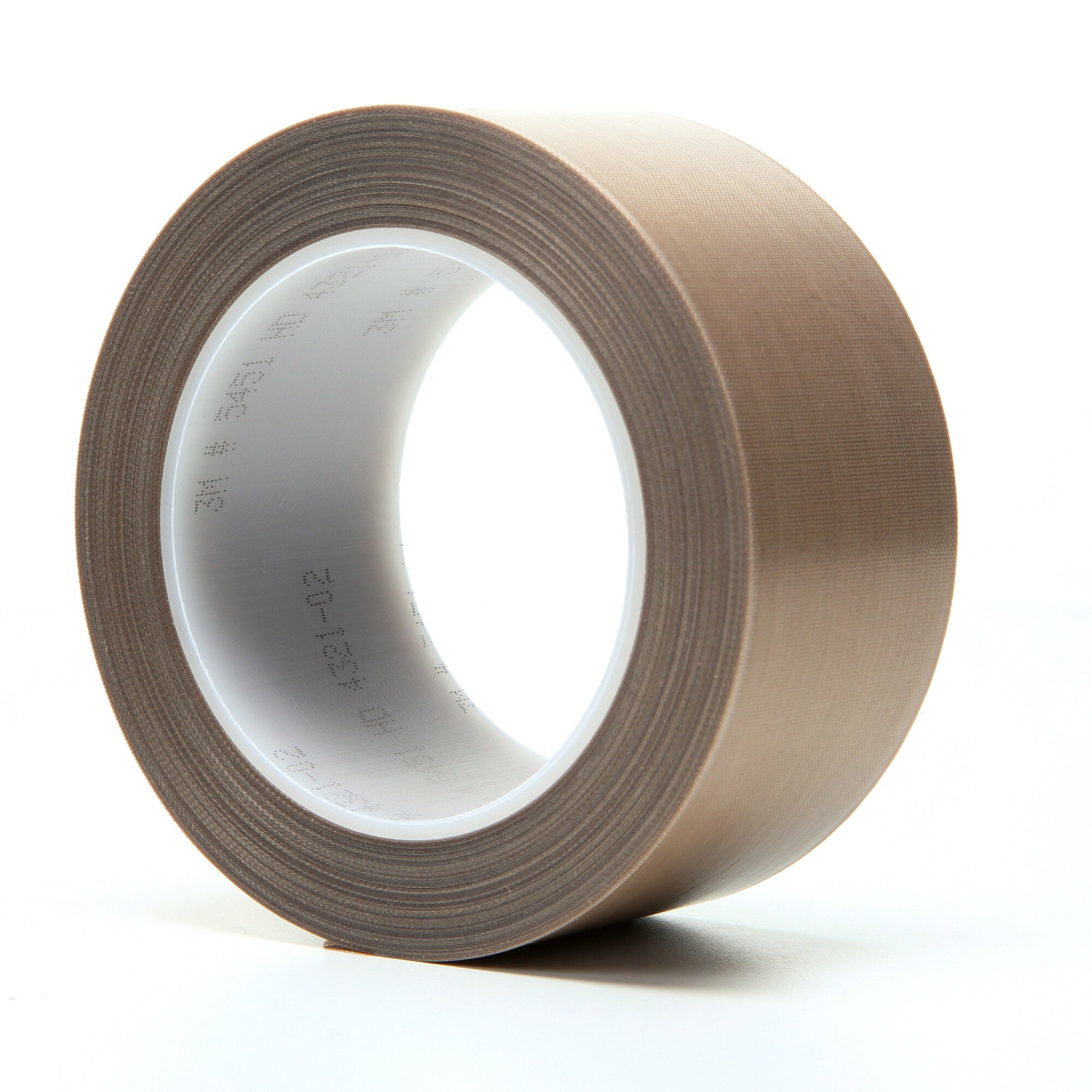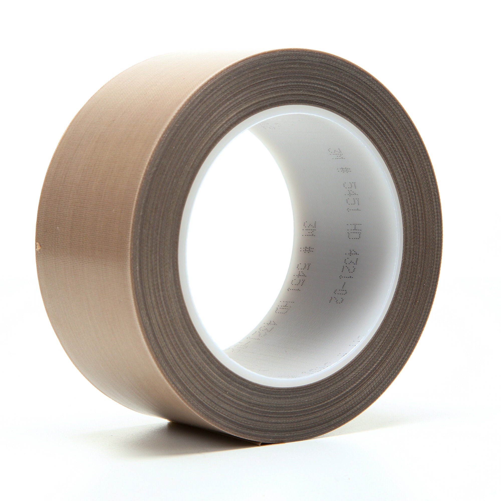 This premium performance 3M PTFE Glass Cloth Tape 5451 has a brown woven glass cloth backing impregnated with PTFE (polytetrafluoroethylene). This tape provides a slick surface on process machinery and offers an extremely low coefficient of friction which, in combination with a pressure sensitive silicone adhesive, creates a non-stick surface that performs at elevated temperatures.Long-Lasting Durability