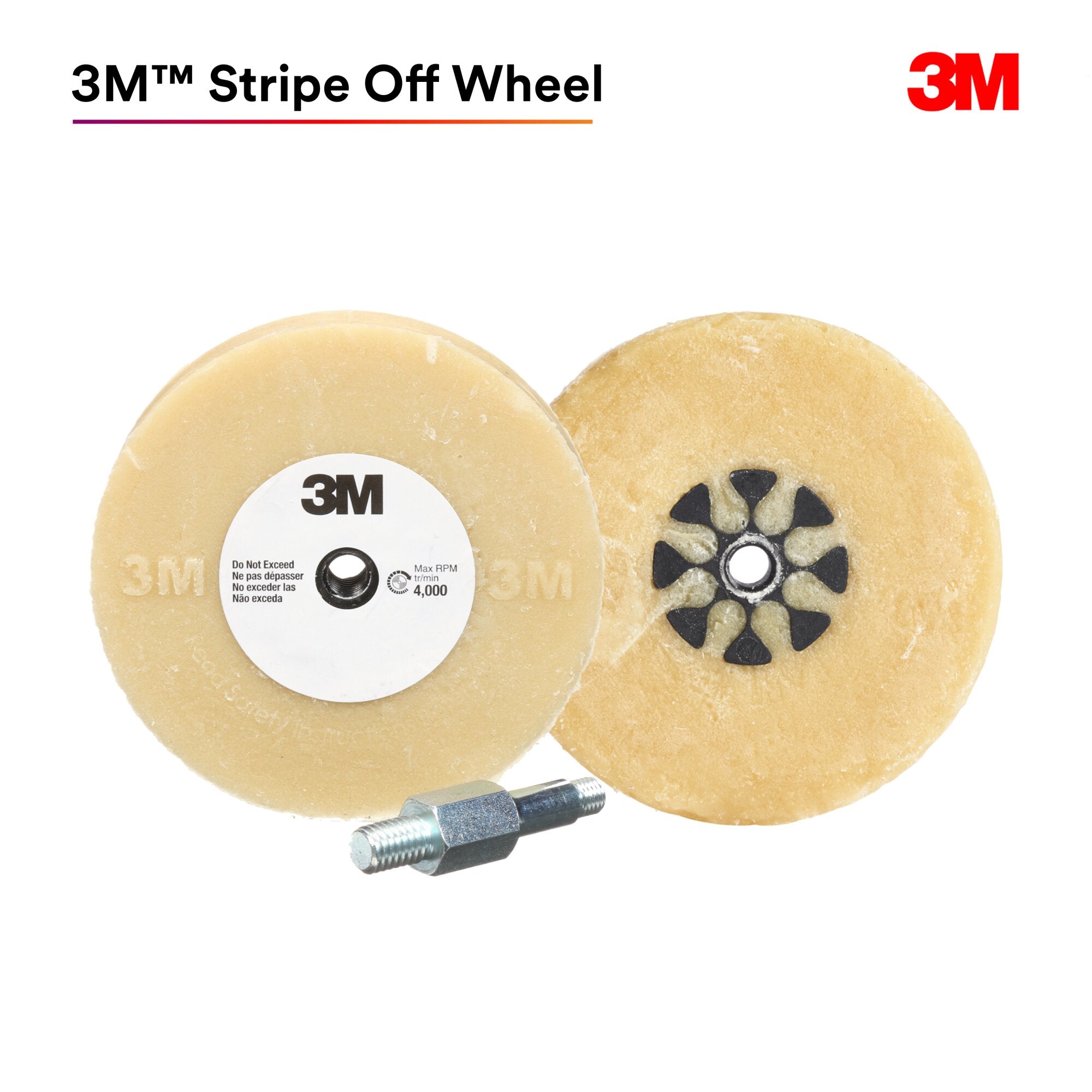 The 3M Stripe Off Wheel was designed for high-speed removal of vinyl, decals, tape, graphics and double sided molding striping and trim. Engineered to help operators effectively and efficiently remove decals, it won't damage the surface below.Our 3M™ Stripe Off Wheel moves in a rapid, circular motion to remove unwanted decals and stripes. The solid molded wheel rids the substrate of decals with friction, instead of abrasives, thereby preventing scratching and damage to the substrate. The wheel can be used at a Max RPM of 4,000. Operators should note that it is important not to exceed the maximum operating speed, because it may compromise the product's performance. Additionally, operators should ensure that the substrate is not heat sensitive, as repeated friction will create heat.