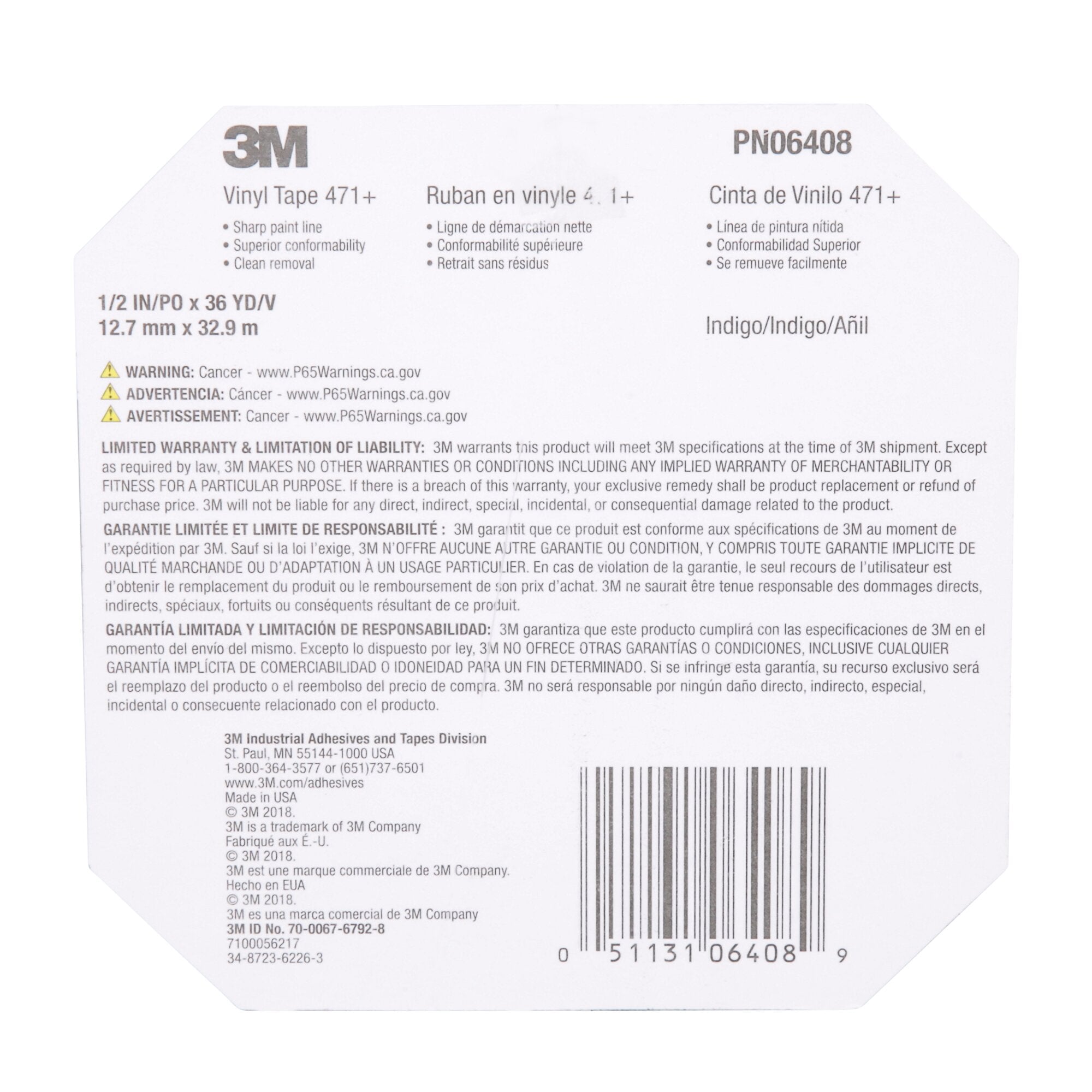 3M Vinyl Tape 471+, Indigo, 1/2 in x 36 yd, 5.3 mil, 72 rolls per case,PN6408