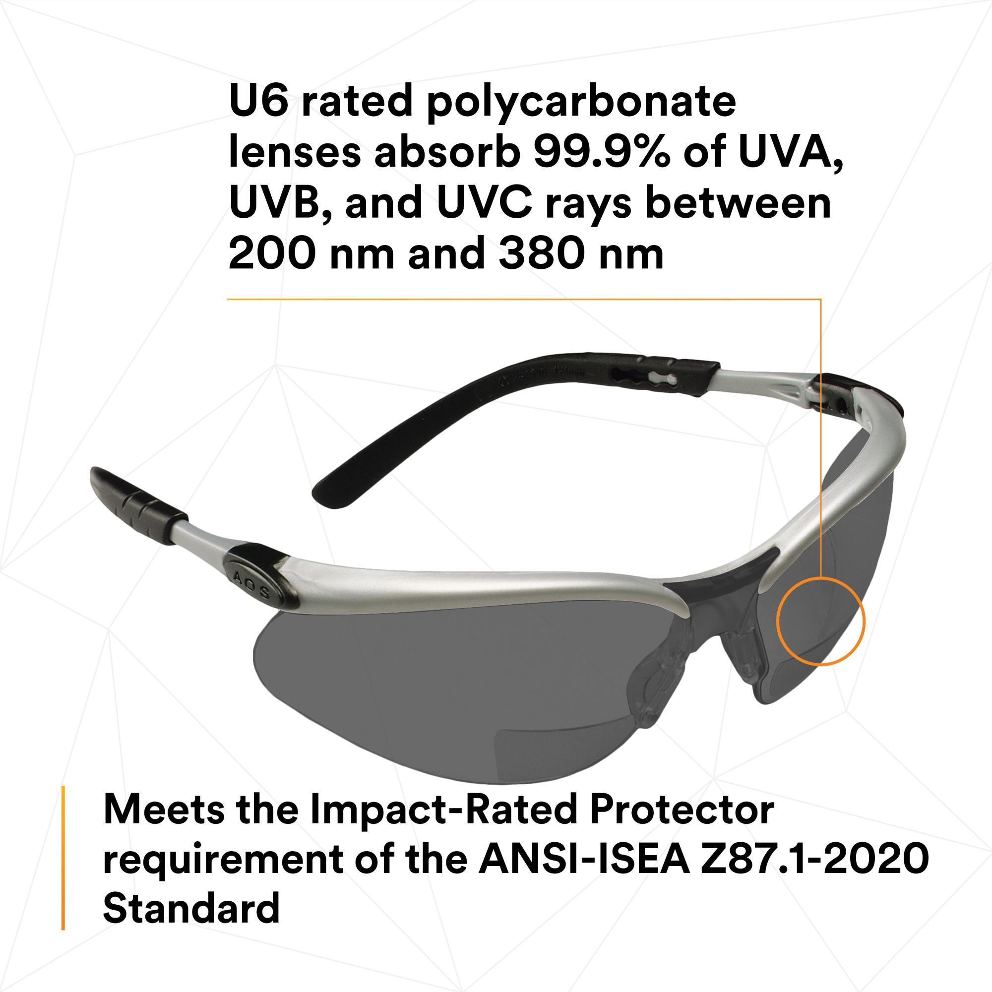 3M™ BX™ Reader Protective Eyewear features built-in magnifying diopters on the lower lenses to provides eye safety to workers who have difficulty reading small print or seeing small detail work. This protective eyewear comes with an adjustable temple length, lens angle, and nose bridge to allow a more comfortable fit. The ability to customize the safety glasses to the wearer makes them more pleasant to use over extended time periods. The nose bridge has also been cushioned for softness and comfort. The sleek, contoured design offers both an attractive appearance and functional eye protection. The impact-resistant polycarbonate lenses absorb 99.9% UV rays. These safety glasses are recommended for the following tasks: assembly and mechanical, chipping, chiseling, cleaning, drilling, grinding, machining, masonry, metal repair, painting, pouring/casting, power fastening, riveting, sanding and sawing. Industries in which these safety glasses are commonly used include aviation, construction, food and beverage, general manufacturing, mining, oil and gas, primary metals, and transportation.