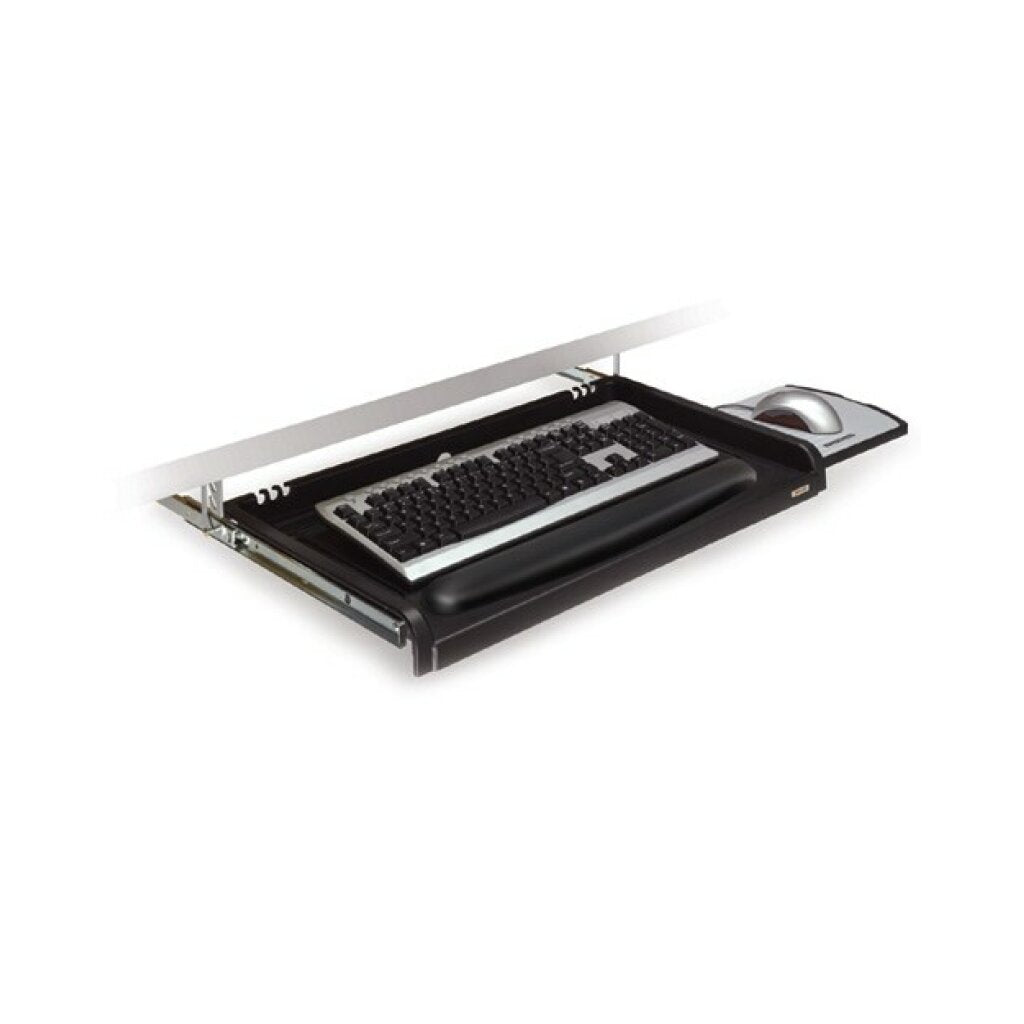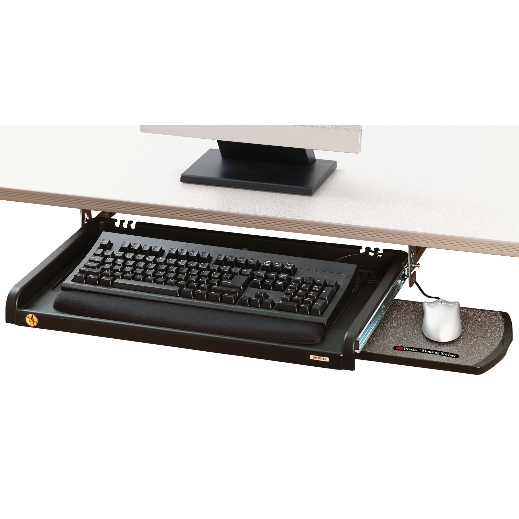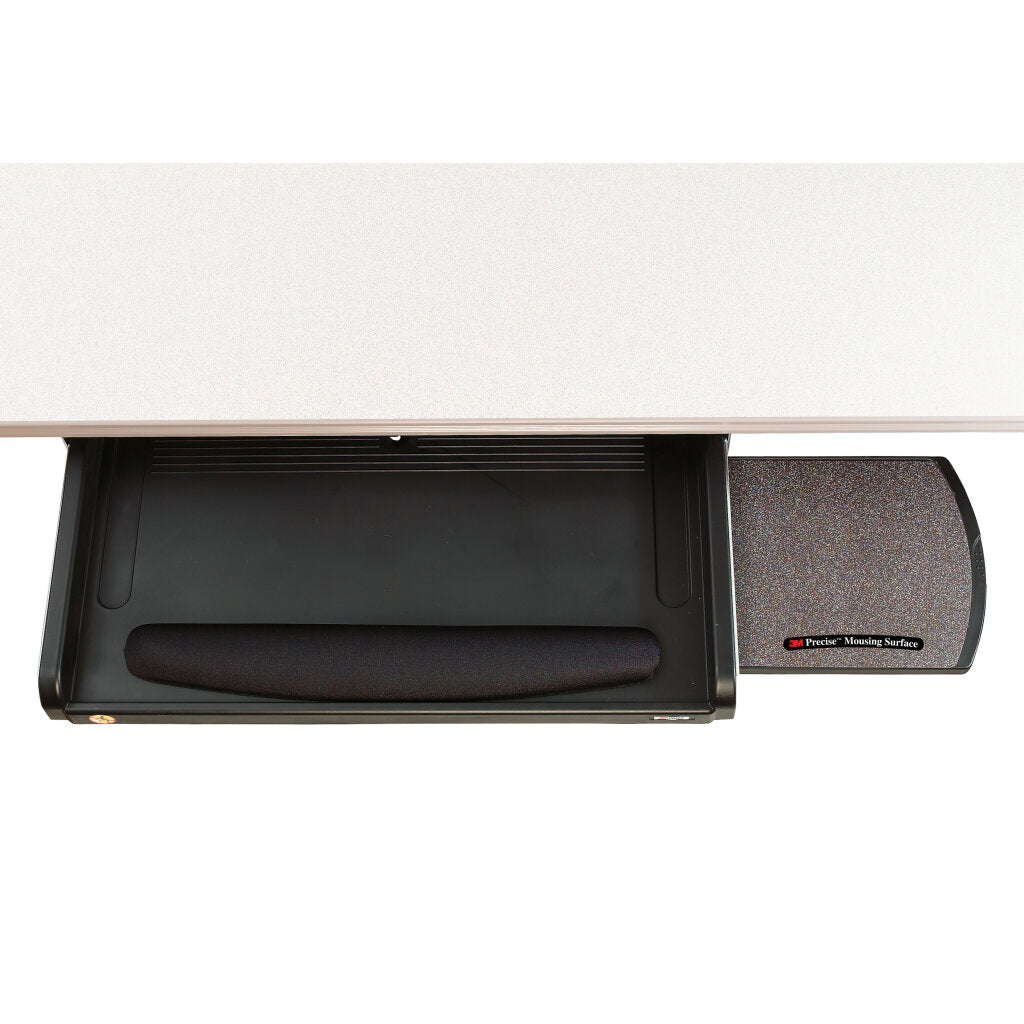 3M Under Desk Keyboard Drawer, 25 in. x 16.5 in x 3.2 in., Black, Three Height Settings, Gel Wrist Rest and Mouse PadHeight adjustable track with ball bearing hardware ensures smooth operation. Includes gel wrist rest with Anti microbial product protection which inhibits the growth of microorganisms, such as bacteria, that can cause stains, odors and product degradation. Includes an easy to clean leatherette gel wrist rest and a retractable mousing platform with the 3M™ Precise™ Mouse Pad.