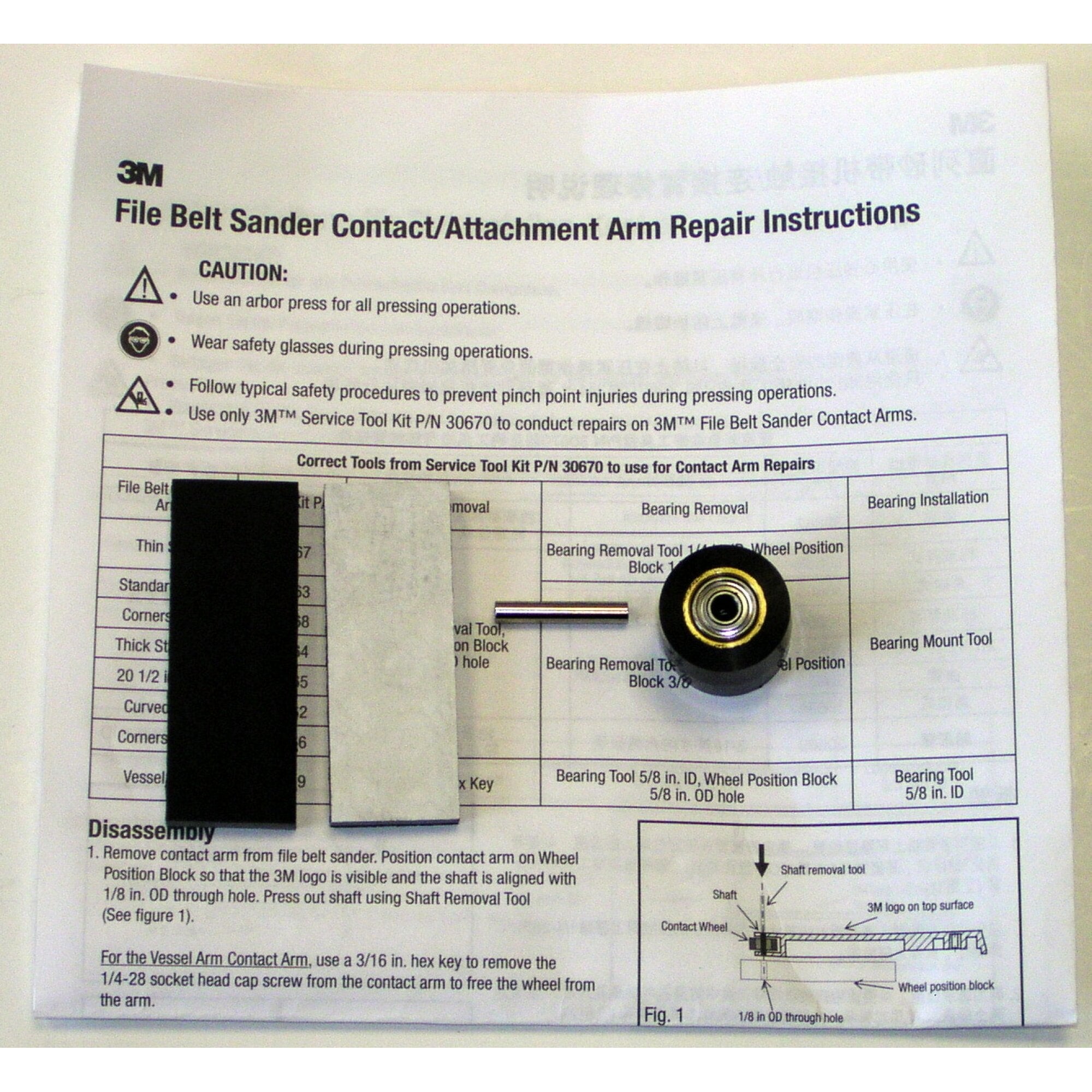 Each kit contains the contact wheel, two bearings, shaft, and platen pad(s), as appropriate for the specific attachment arm. Our 3M™ File Belt Arm Repair Kits were designed to economically repair File Belt Sander Attachment Arms without replacing the entire arm assembly.
