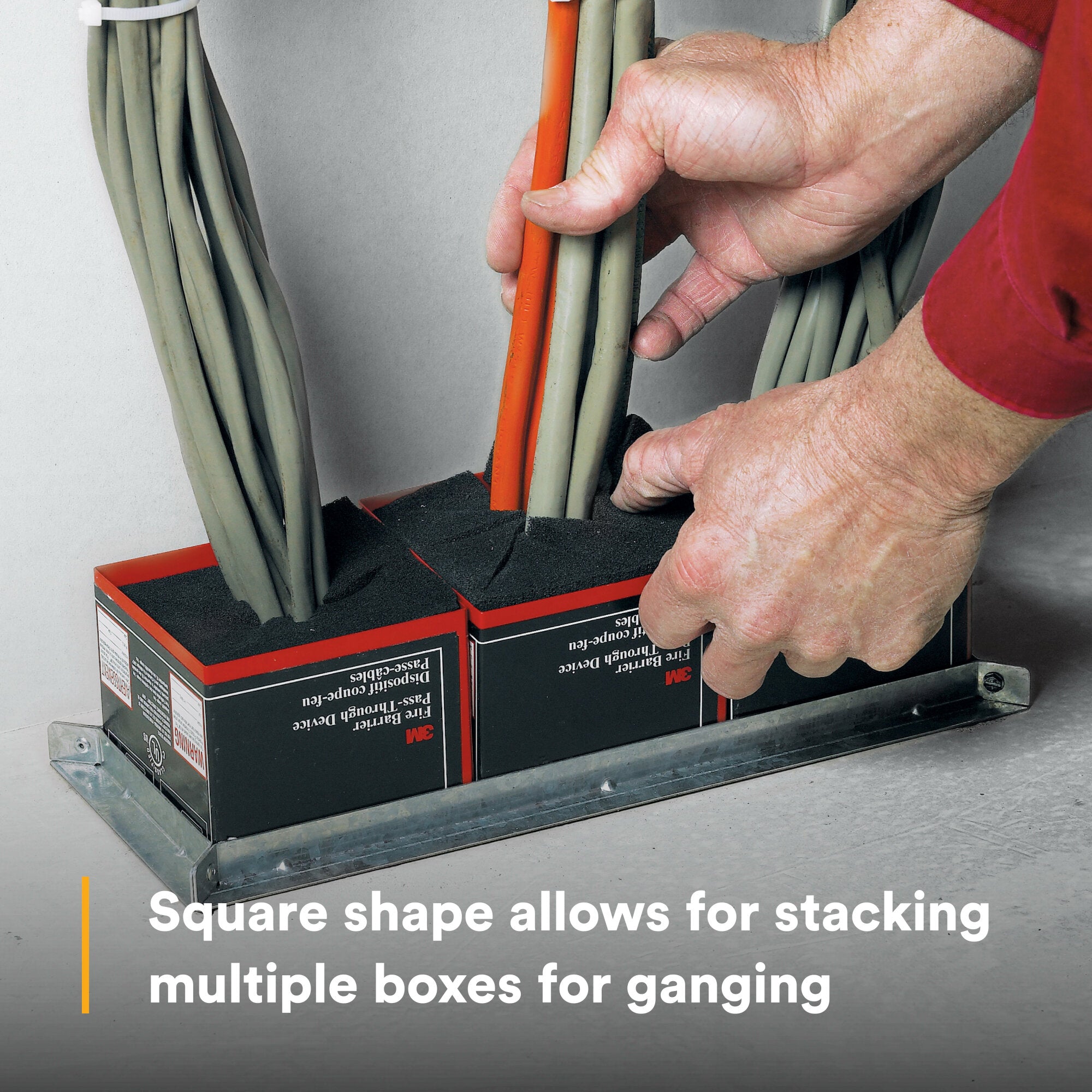 3M™ Fire Barrier Pass-Through Device Square is an ideal firestop solution for through wall penetrations for cabling. This one-piece, square, hinged metal enclosure features a combination of a fixed firestopping intumescent material and foam smoke seals at each end. The re-enterable device installs quickly and easily for new construction or retrofit applications. It is built for square openings and allows for stacking multiple boxes for easy cable management. It is suitable for blank penetrations, or it hinges over existing cables. It can be secured using optional mounting brackets or firestop sealants (sold separately). When adding or removing cables in the penetration, technicians simply remove and reinstall the foam plugs instead of the entire device. This Fire Barrier Pass-Through Device is designed to provide years of dependable through-penetration firestopping with no reapplication or maintenance.