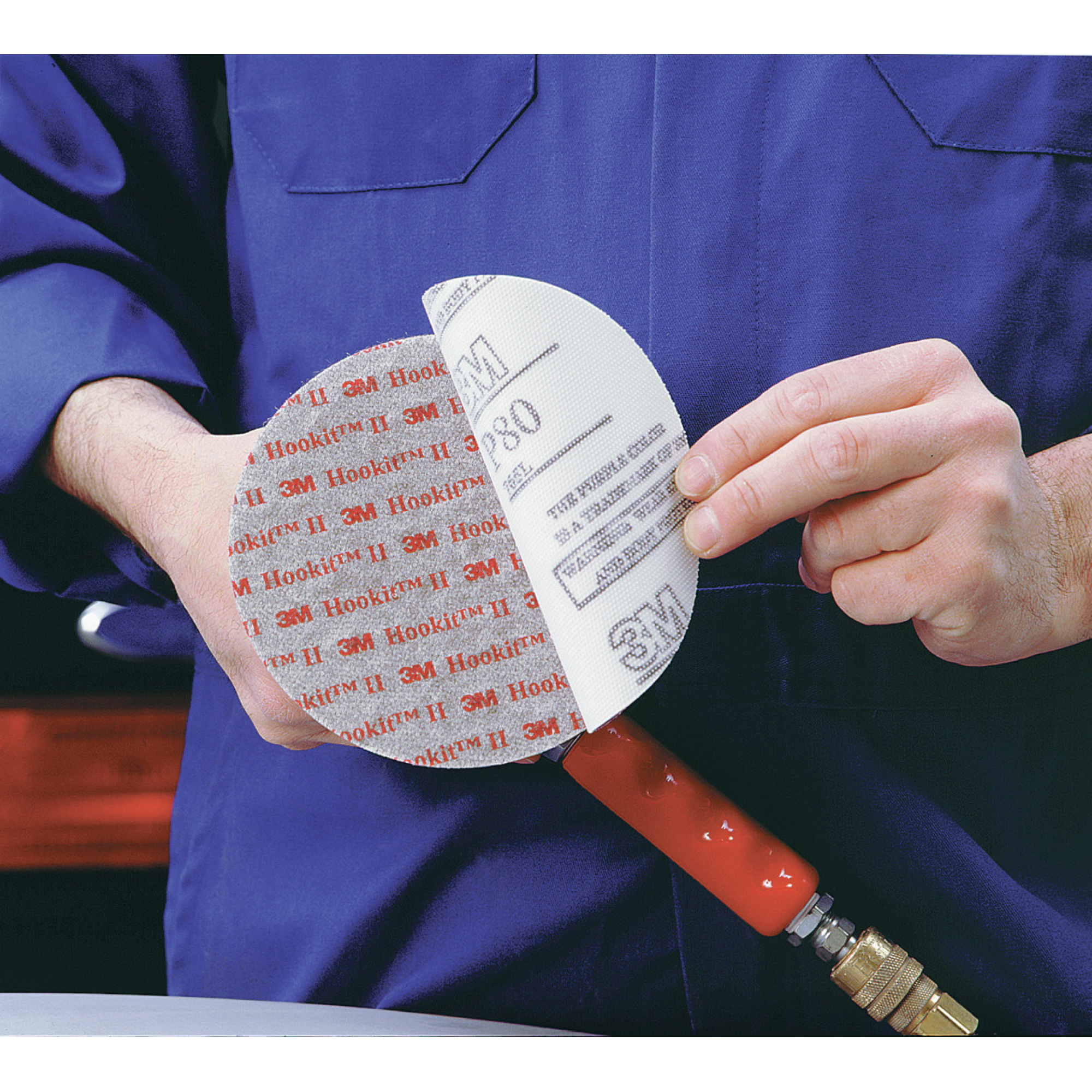 The Hookit™ attachment system has a hook-and-loop feature which makes disc attachment, removal, and re-attachment clean and easy. It also facilitates use and re-use of the disc for maximum product life. Hookit™ discs have a brushed nylon loop backing of the type most commonly used in everyday hook-and-loop applications. 3M™ Hookit™ disc pads (sold separately) feature hooks which grip the brushed nylon loop backing. It’s simple: just attach the disc on and start sanding. The disc removes just as cleanly and easily. The Hookit™ system is designed for work spaces and applications where adhesive backed discs may become contaminated by dust, dirt, or flying debris.