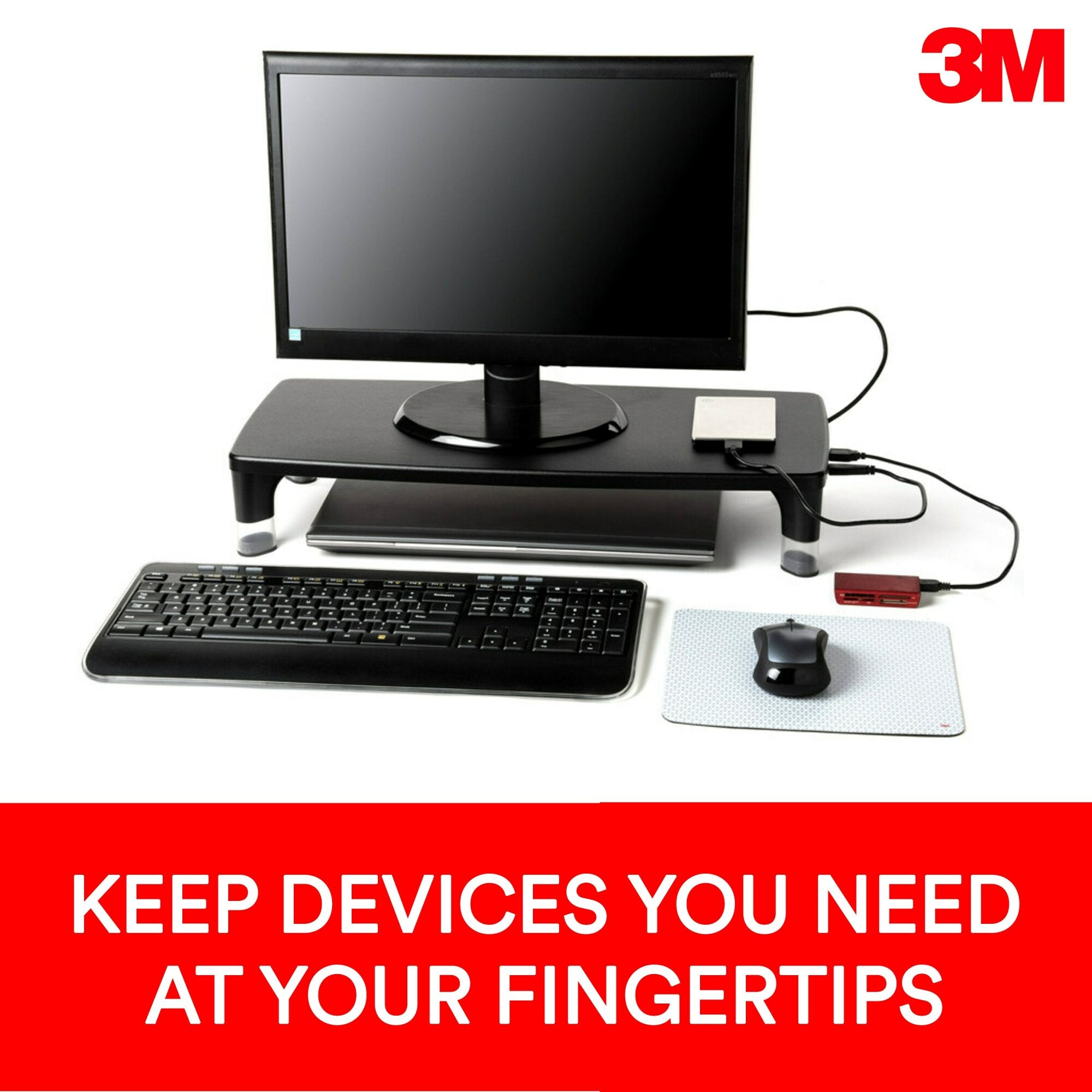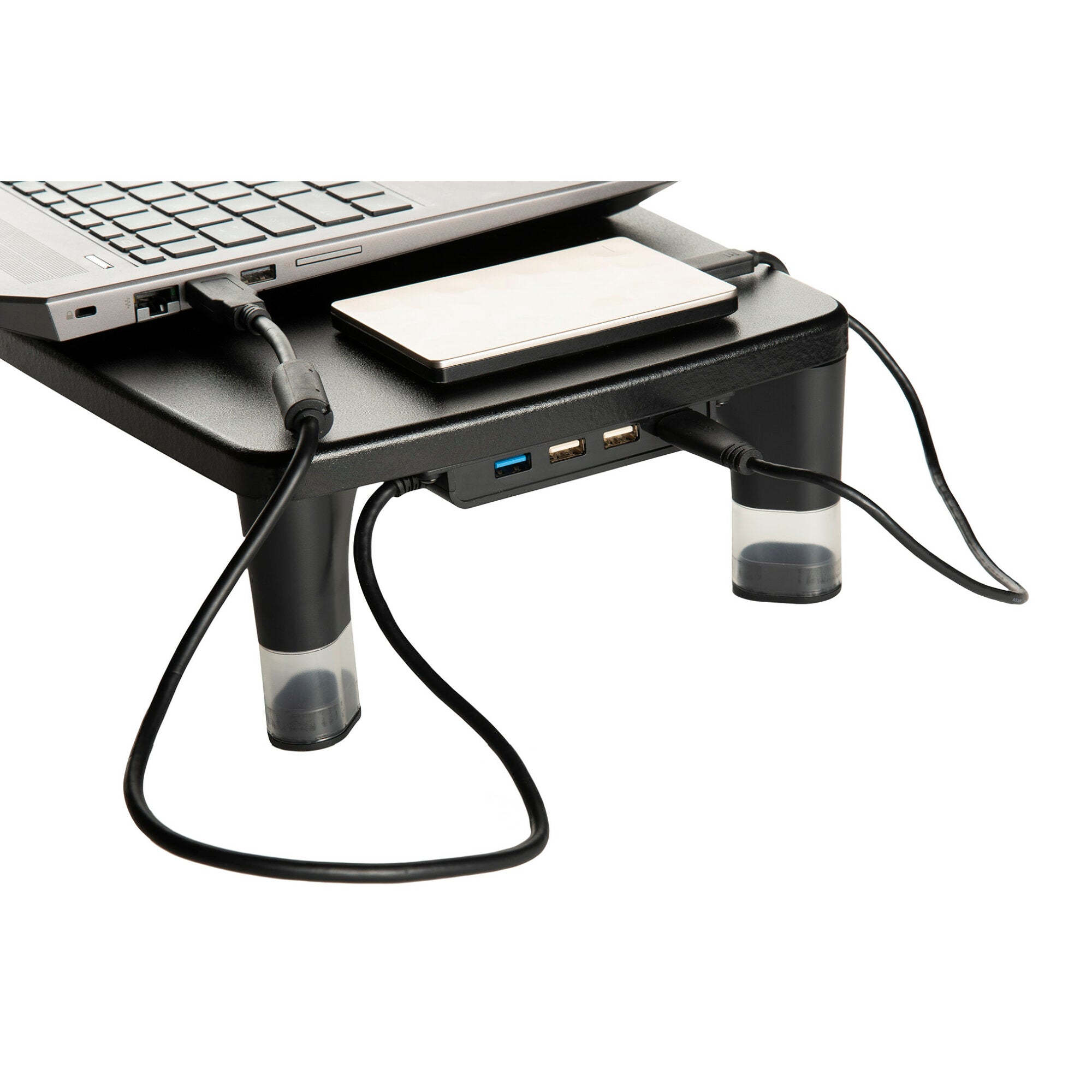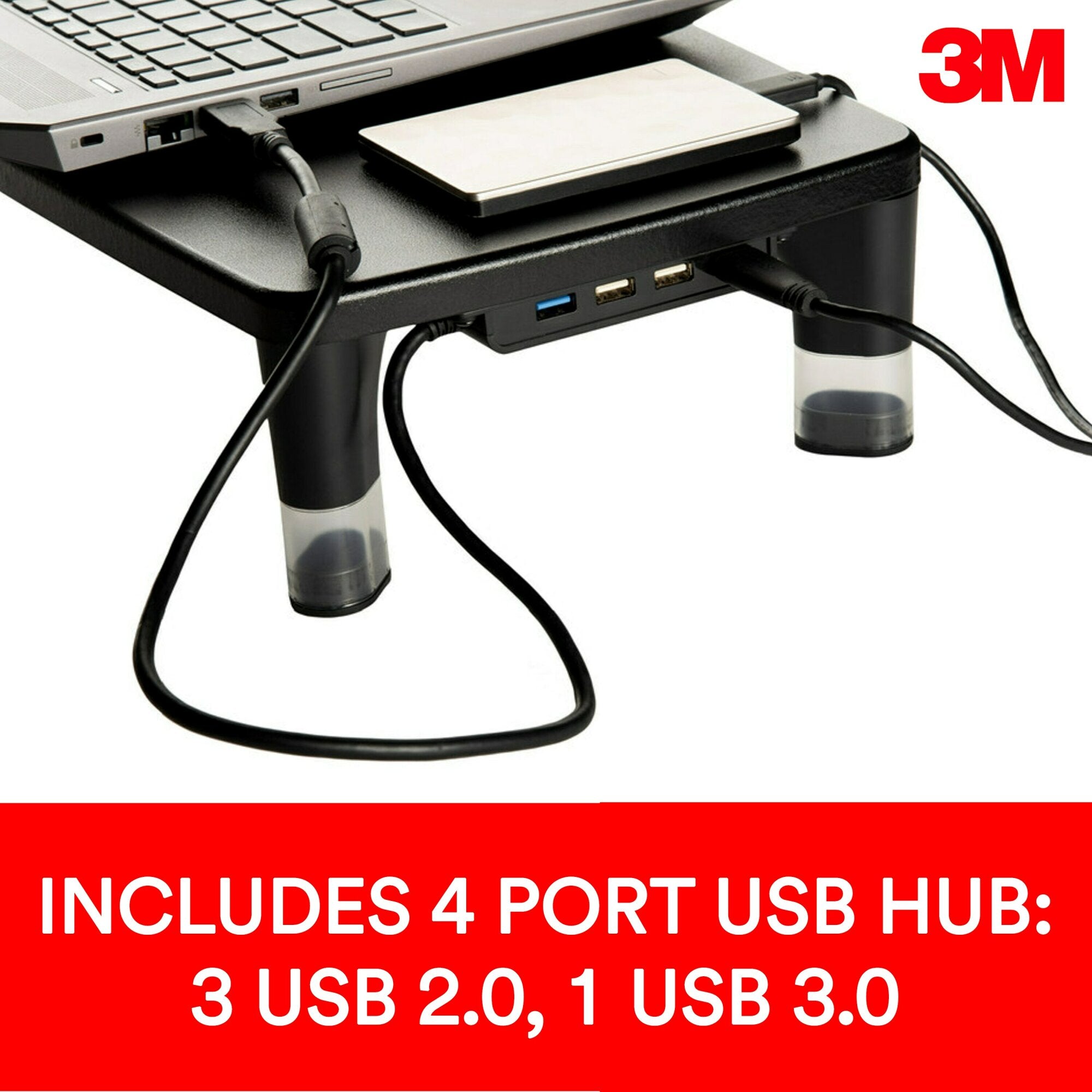 Height adjustable stand is great for computer monitors, laptops, TVs, speakers, printers and more. 4-Port USB Hub allows you to connect 3 USB 2.0 devices and 1 USB 3.0 device to your computer keeping everything you need right at your finger tips. Quick and easy assembly. Anti-slip rubber feet protect work surface. Holds up to 33 lbs.Height adjustable stand is great for computer monitors, laptops, TVs, speakers, printers and more. Plug and play 4-Port USB Hub allows you to connect 3 USB 2.0 devices and 1 USB 3.0 device to your computer keeping everything you need right at your finger tips. Conveniently connect or charge a variety of devices including mice, keyboards, video game consoles, external hard drives, smart phones, digital cameras and flash drives. Easy to adjust height settings from 2.76” to 3.94” to get your monitor to a comfortable height for viewing. Quick and easy assembly. Anti-slip rubber feet protect work surface. Holds up to 33 lbs.
