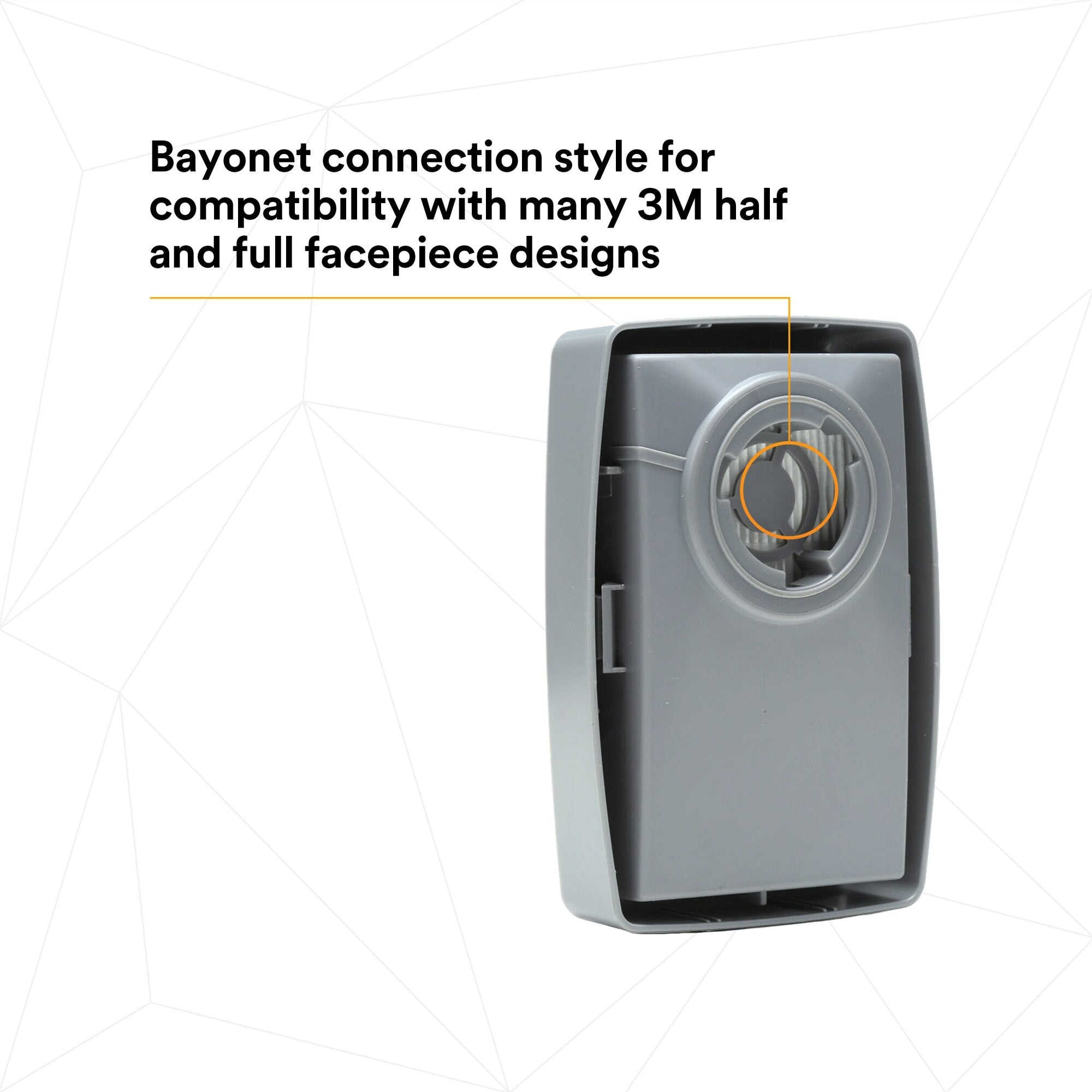 - Bayonet compatibility allows use with many 3M™ half and full facepieces and certain 3M™ Scott™ full facepieces