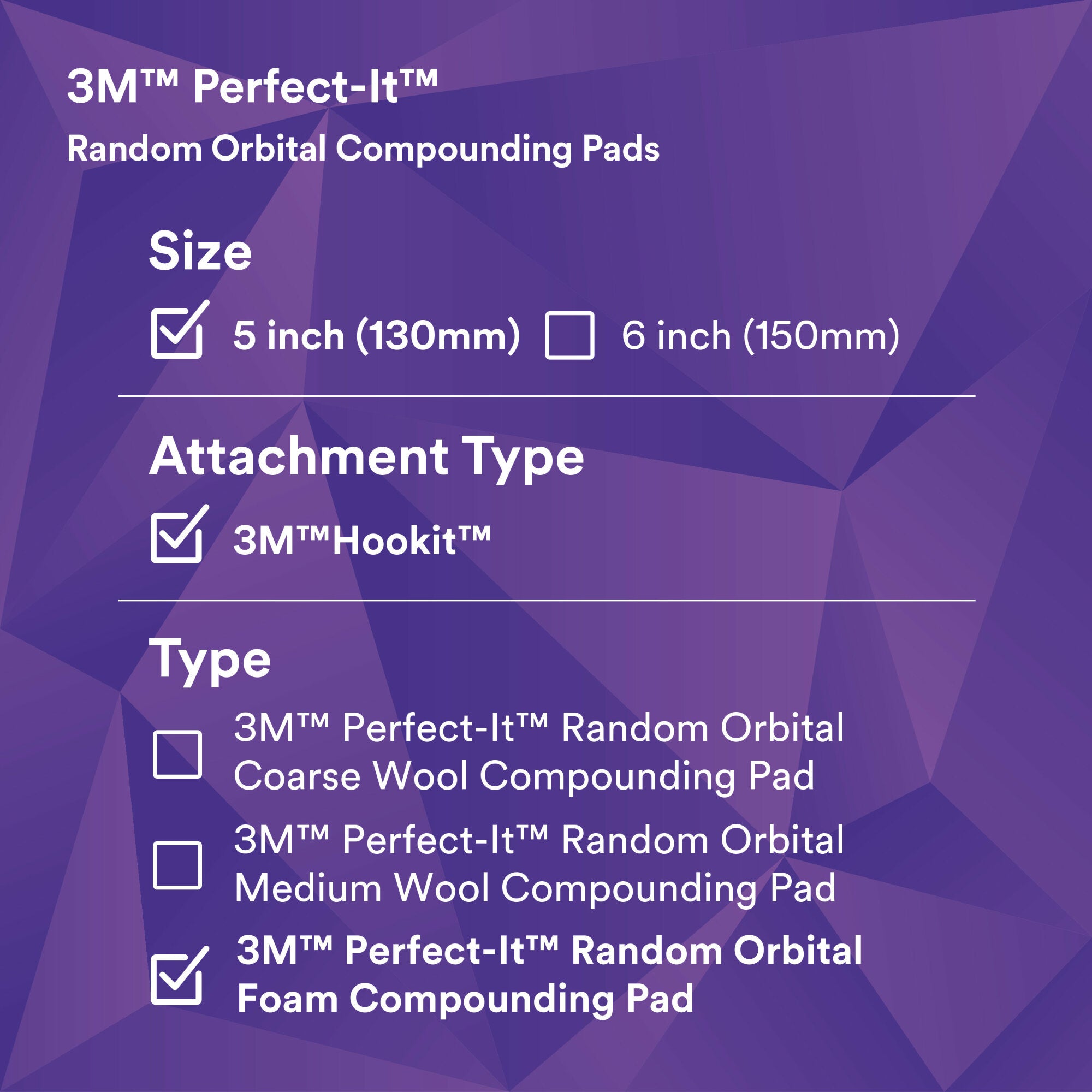 3M™ Perfect-It™ Random Orbital Foam Compounding Pad is available in 5-inch and 6-inch diameters. This single-sided pad features a 3M™ Hookit™ attachment for easy change-outs.