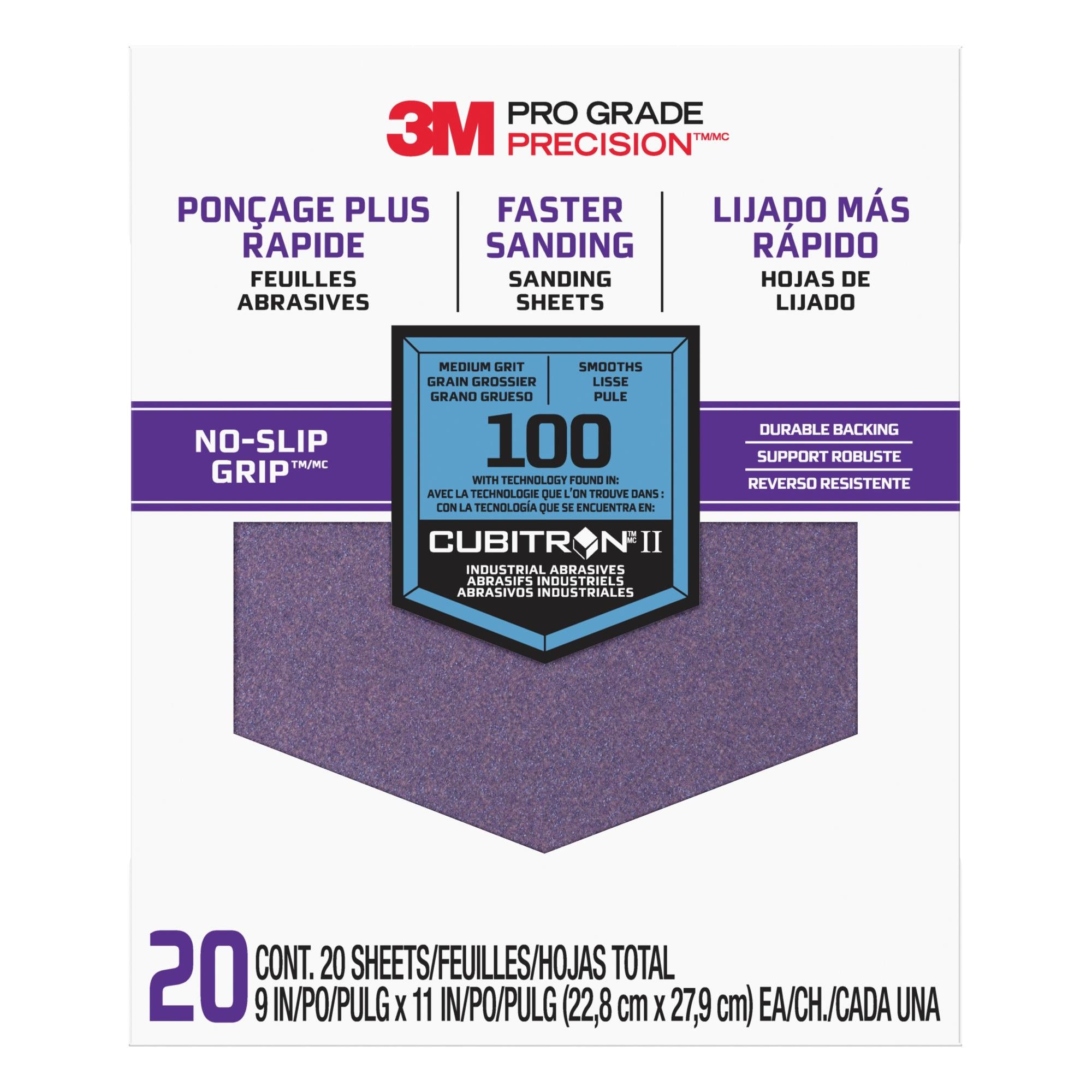 3M Pro Grade Precision Faster Sanding Sanding Sheets are better than ever, thanks to the combination of NO-SLIP GRIP backing and premium mineral technology found in CUBITRON II Industrial Abrasives, providing longer sheet life, less effort and less hand fatigue than conventional sandpaper.Get the job done in a flash with the help of 3M Pro Grade Precision Faster Sanding Sheets. This premium sandpaper makes sanding your surface a breeze with its NO SLIP GRIP backing and high quality materials. Each large sheet is perfect for customizing to your needs, and its unique coating resists clogging. Whether you’re sanding wood, drywall, or metal, each sheet can be used on wet or dry surfaces, and the durable backing stands up to the job. Whether you’re working construction or refinishing a piece of furniture, rely on 3M Pro Grade Precision Faster Sanding Sheets to get the job done right.
