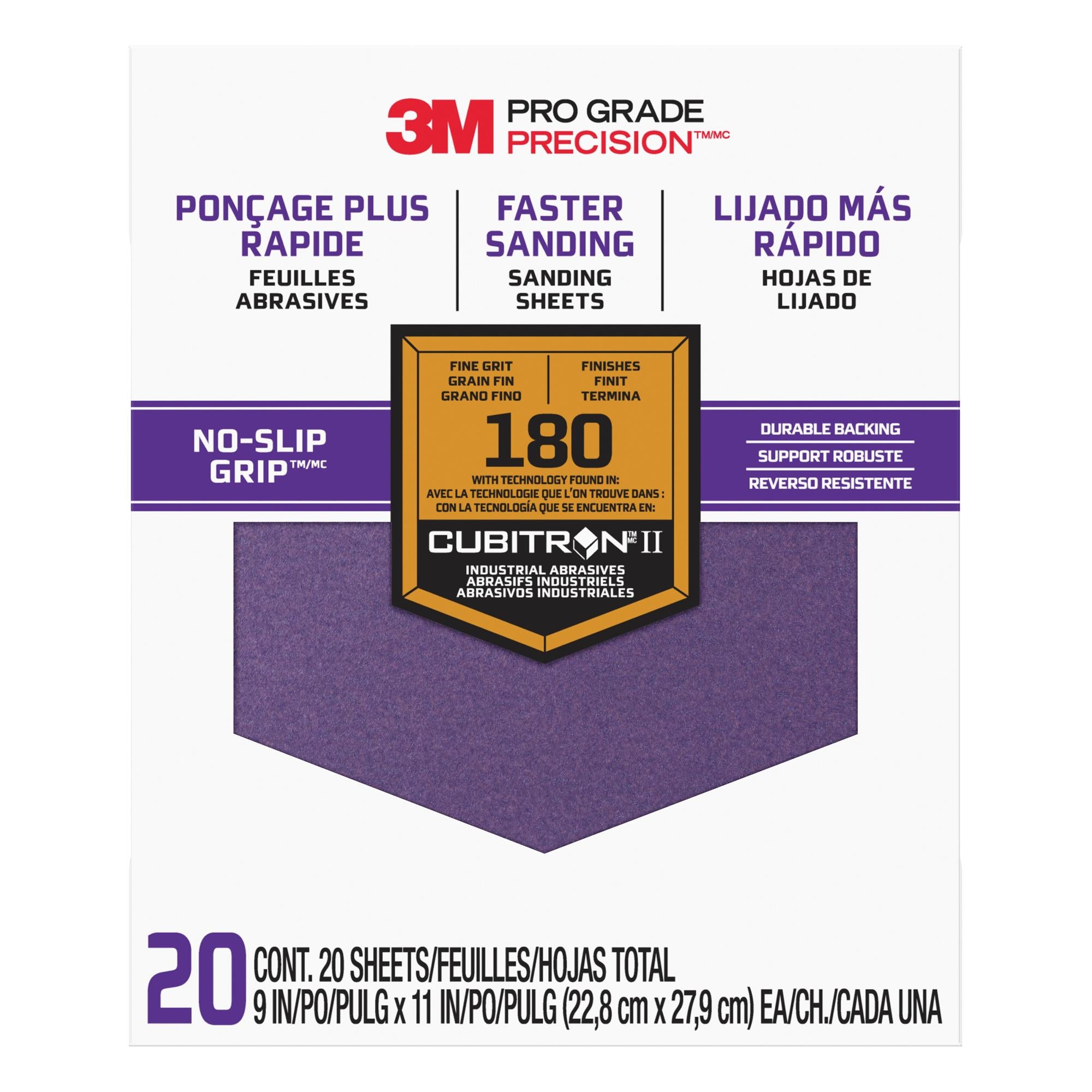 3M Pro Grade Precision Faster Sanding Sanding Sheets are better than ever, thanks to the combination of NO-SLIP GRIP backing and premium mineral technology found in CUBITRON II Industrial Abrasives, providing longer sheet life, less effort and less hand fatigue than conventional sandpaper.Get the job done in a flash with the help of 3M Pro Grade Precision Faster Sanding Sheets. This premium sandpaper makes sanding your surface a breeze with its NO SLIP GRIP backing and high quality materials. Each large sheet is perfect for customizing to your needs, and its unique coating resists clogging. Whether you’re sanding wood, drywall, or metal, each sheet can be used on wet or dry surfaces, and the durable backing stands up to the job. Whether you’re working construction or refinishing a piece of furniture, rely on 3M Pro Grade Precision Faster Sanding Sheets to get the job done right.