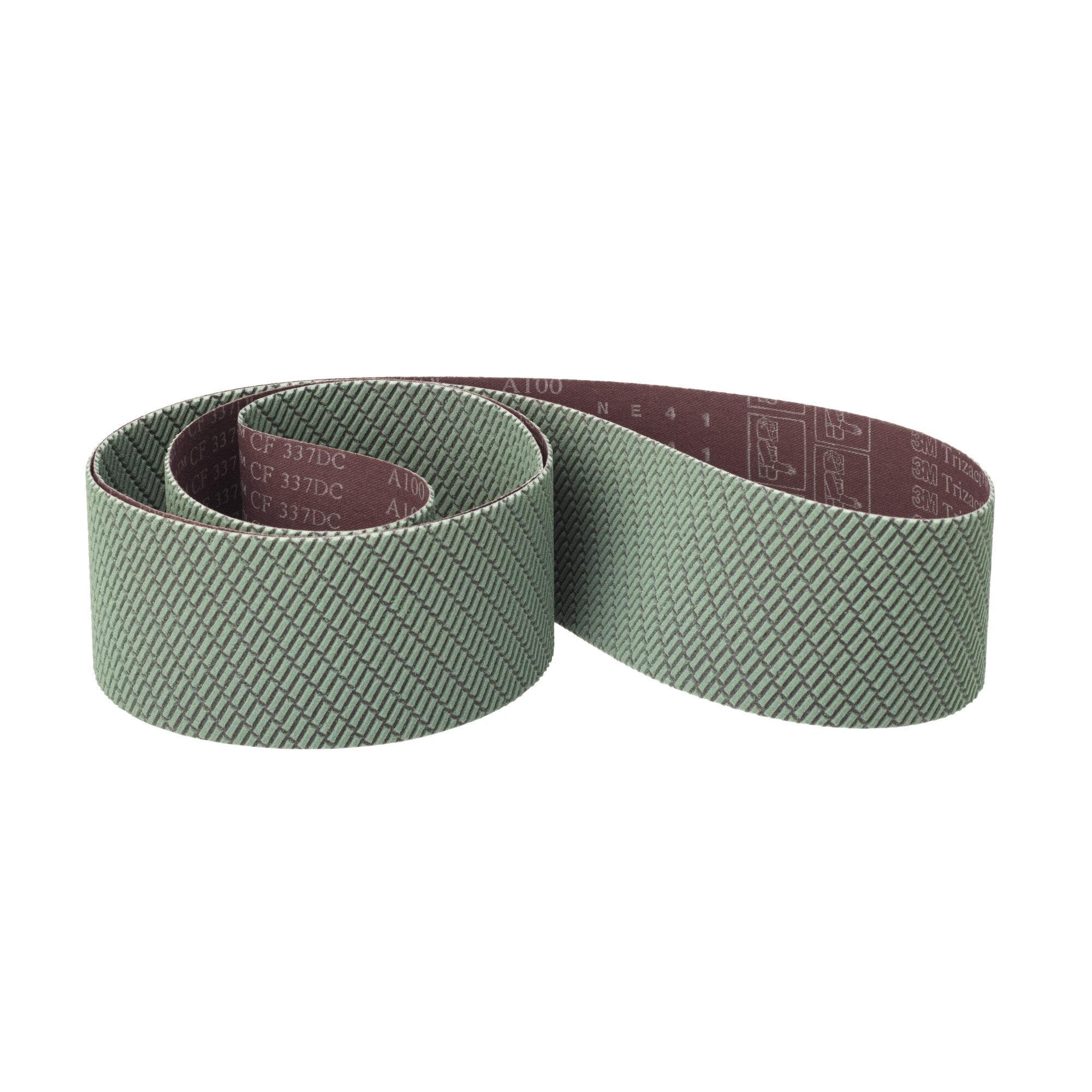 The 3M Trizact Cloth Belt 337DC delivers consistently in intermediate to final finish, medium pressure applications. Designed with aluminum oxide and a grinding aid on a durable X- weight cloth backing, this belt is available in widths from 1/2 to 24 inches and grades from A300 to A30.Long Life, Sustained Cut, Consistent Performance