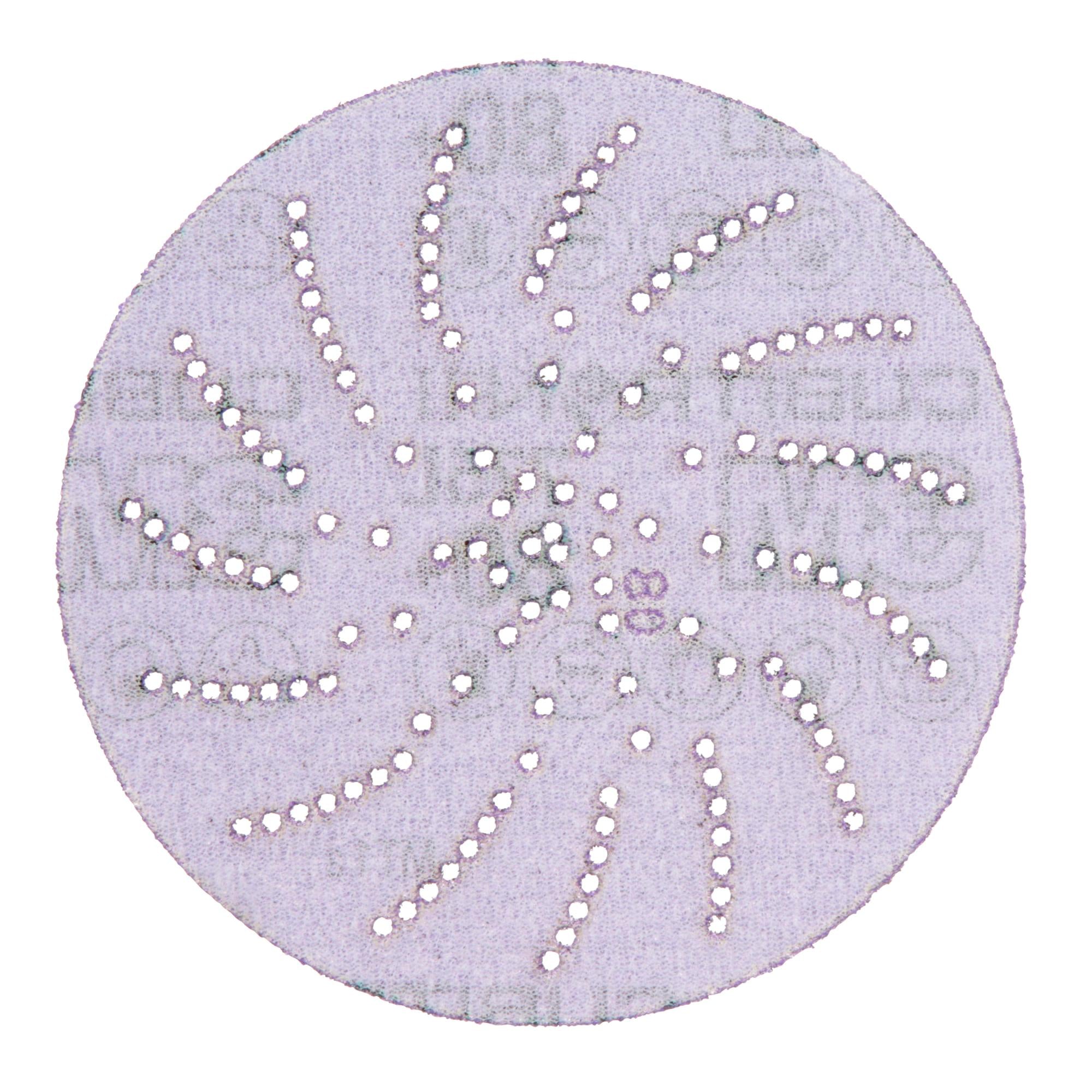 3M Xtract Cubitron II Disc 775L features a 3M proprietary multi-hole pattern for improved dust extraction in finishing applications. Part of the 3M Xtract Series, designed for optimal dust removal. An innovative multi-hole pattern extracts dust better than 5- or 6-hole products increasing cut and dramatically increasing disc life. The design does not need to align with the disc pad holes, making switching the discs fast, easy and convenient. Featuring ceramic 3M Precision-Shaped Grain, a revolutionary advancement in abrasive technology. The triangular shaped ceramic mineral is designed to slice through the substrate, rather than gouging or plowing like conventional abrasives, resulting in a disc that cuts up to 2x as fast as conventional abrasives. The film backing delivers outstanding tear resistance, flexibility and a consistent, uniform finish on a variety of substrates.These discs are ideal for a broad range of applications focused primarily on stock removal, and are effective on a wide variety of substrates, including metals, composites, gelcoat, and whitewood. The film backing offers greater tear resistance than paper discs, for additional durability and edge retention. For best results, pair with 3M Xtract™ Random Orbital Sanders. Open coat construction means the abrasive grains are placed with space between them to help evacuate dust and other sanding debris and avoid clogging the cutting edge of the grains. The load-resistant coating allows the disc to continue cutting even when sanding softwoods, paints, and other materials that would, otherwise, clog the disc and hinder sanding ability. All of this adds up to increased productivity and reduced material consumption. Sandpaper discs cut better and last longer when dust isn't loading the cutting surface of the abrasives. Our proprietary multi-hole pattern on 3M Xtract™ products removes dust at a higher rate than 5- or 6-hole products. This hole design doesn't even require alignment of holes with the disc pad, making disc changes quick and simple. For maximum dust extraction, use this disc with a 3M Xtract™ Back-up pad and a random orbital sander with vacuum (both sold separately).
