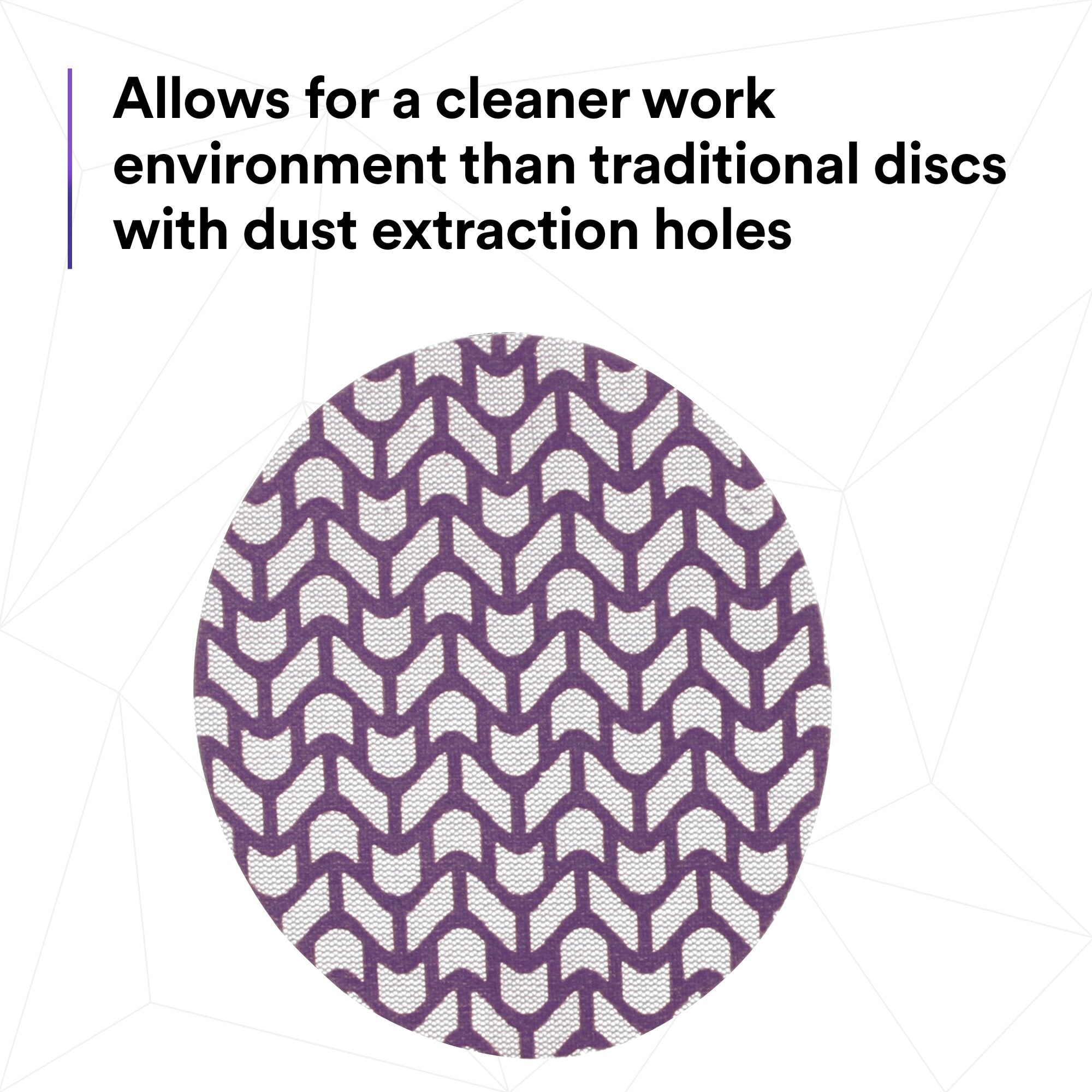 3M Xtract™ Cubitron™ II Net Disc 710W extracts up to 99% of dust produced during sanding and creating a cleaner, virtually dust-free work environment. Plus, the 3M Precision-Shaped Grain in the disc cuts with less pressure required by the operator, making for more comfortable sanding.