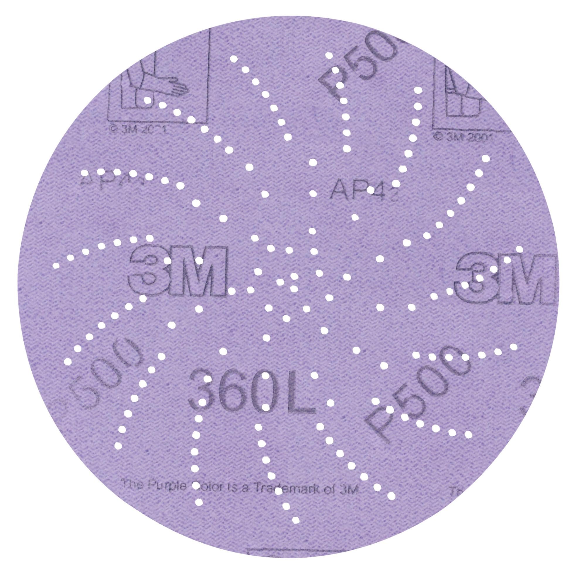 3M Xtract Film Disc 360L offers the latest innovation in dust evacuation. Multi-hole patterns evacuate dust better than 5- or 6-hole productssignificantly increasing cut-rate and disc life. The new design does not need to align with the disc pad holes, making switching the discs fast, easy, and convenient.Open-Coat Construction Minimizes LoadingSandpaper discs cut better and last longer when dust isn't loading the cutting surface of the abrasives. Reducing dust is easier than ever with 3M Xtract™ sanding discs. An open coat means the abrasive grains have space between them so that sanding debris collects in the spaces rather than loading the cutting edge of the grains. The load resistant coating allows the disc to continue cutting even when sanding softwoods, paints, and other materials that would, otherwise, clog the disc and hinder sanding ability. Meanwhile, the innovative multi-hole pattern extracts dust better than 5- or 6-hole products — increasing cut and dramatically increasing disc life.
