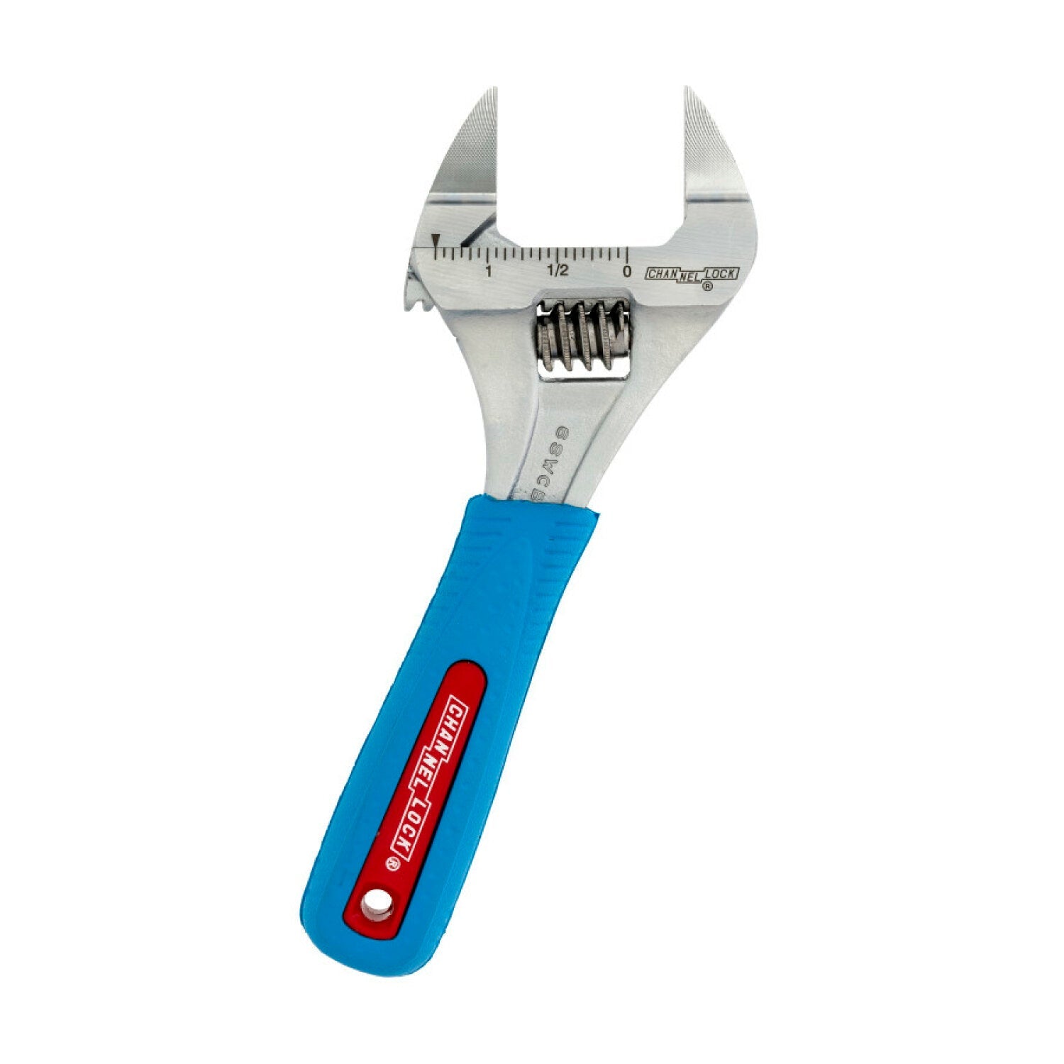 Tackle big jobs in small spaces with the CHANNELLOCK® 6" CODE BLUE® WIDEAZZ®Xtra Slim Jaw Adjustable Wrench featuring 50% slimmer jaws when compared to a standard wrench of its size. A super-wide jaw opening provides greater capacity in a lightweight, compact adjustable wrench, supporting larger nuts and bolt sizes. The combination of a smart and comfortable tapered handle design with CODE BLUE® comfort grips, precise 4-thread knurl and minimal head width improves performance in confined spaces. CHANNELLOCK® Adjustable Wrenches are made in Spain and forged from rugged chrome vanadium steel.