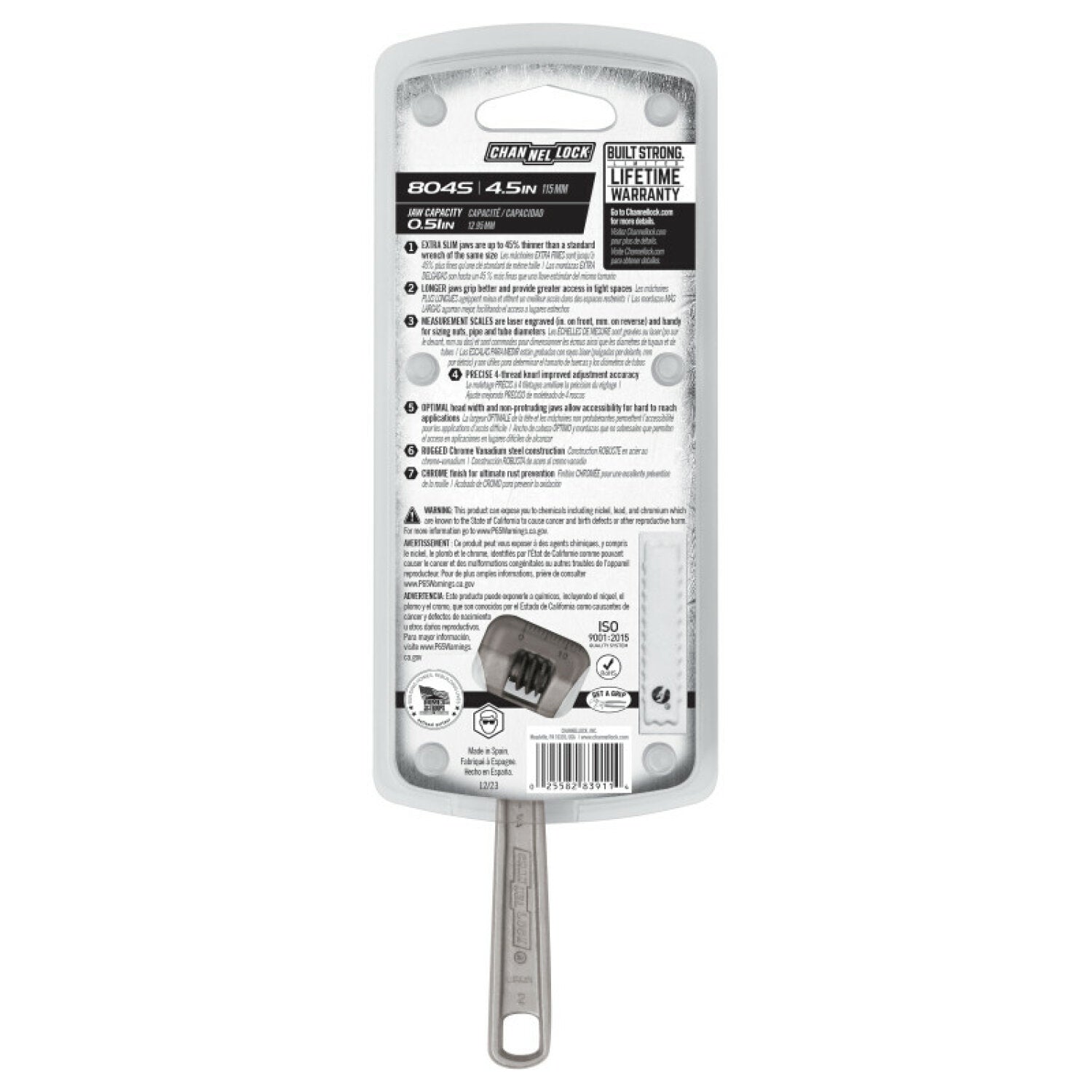 The CHANNELLOCK® 804S Xtra Slim Jaw Adjustable Wrench features 45% slimmer jaws than a standard wrench of its size. The combination of a smart and comfortable tapered handle design, 4-thread knurl and minimal head width provides precise performance in confined spaces. CHANNELLOCK® Adjustable Wrenches are made in Spain and forged from rugged chrome vanadium steel.