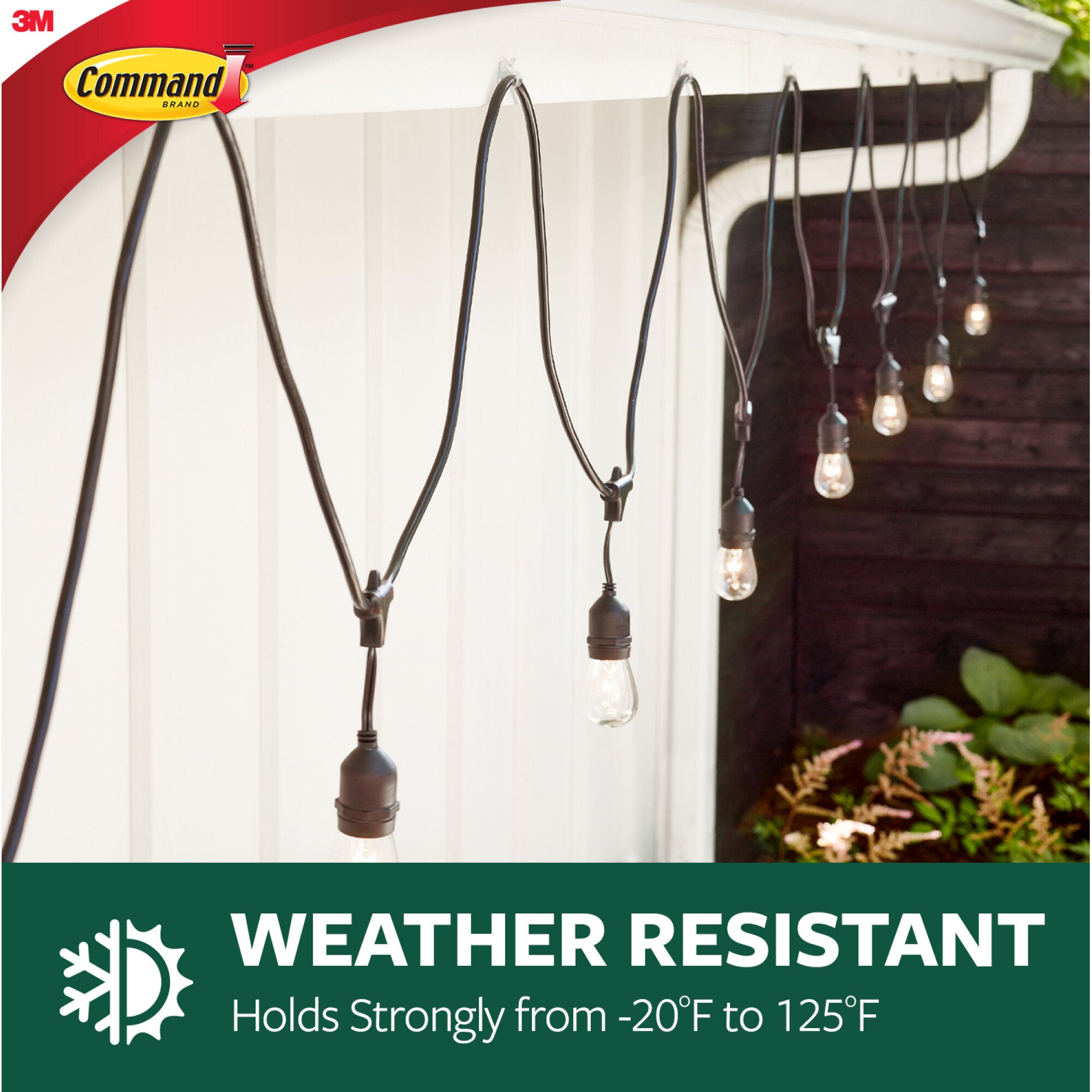 Damage Free Hanging. Holds Strongly. Removes Cleanly.Warm up your exteriors, damage free, with Command Outdoor Light Clips by 3M. Outdoor Command Clips let you hang Christmas lights, rope lights, decorations and more where you want without tools or nails. Command Outdoor adhesive holds strongly through rain, snow, and extreme temperatures on smooth, finished surfaces, and these string light clips remove cleanly¬ with no sticky residue or damage left behind. Make everyday, spring patio, and Christmas decorating fun and easy with Command Outdoor Light Clips.