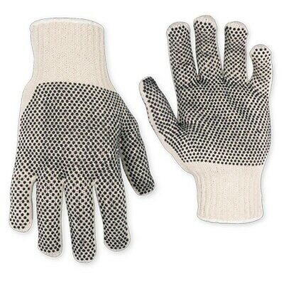 Cotton/polyester knit work gloves with PVC grip dots on both sides. Elasticized wrist. One size fits most.