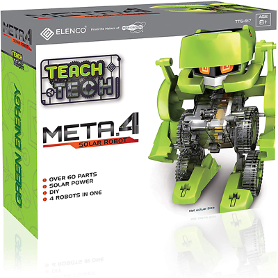 Meta.4 introduces Robotics to younger children with larger, easier to handle parts. Build and rebuild 4 different models, one at a time. Your Meta.4 is powered by clean, green, sunlight so no batteries are ever needed. Builds can be easily dissembled and reassembled to make any one of the 4 models: