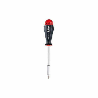 Felo Multi Bit Screwdriver with 8 bits, sizes 0.6 x 4.5 Slotted, 1.0 x 5.5 Slotted, 1.2 x 6.5 Slotted, Phillips #0, Phillips #1, Phillips #2, Pozidriv #1, and Pozidriv #2. Extra long shaft for workplaces difficult to reach. Easy to reach bits, conveniently stored inside the handle.
