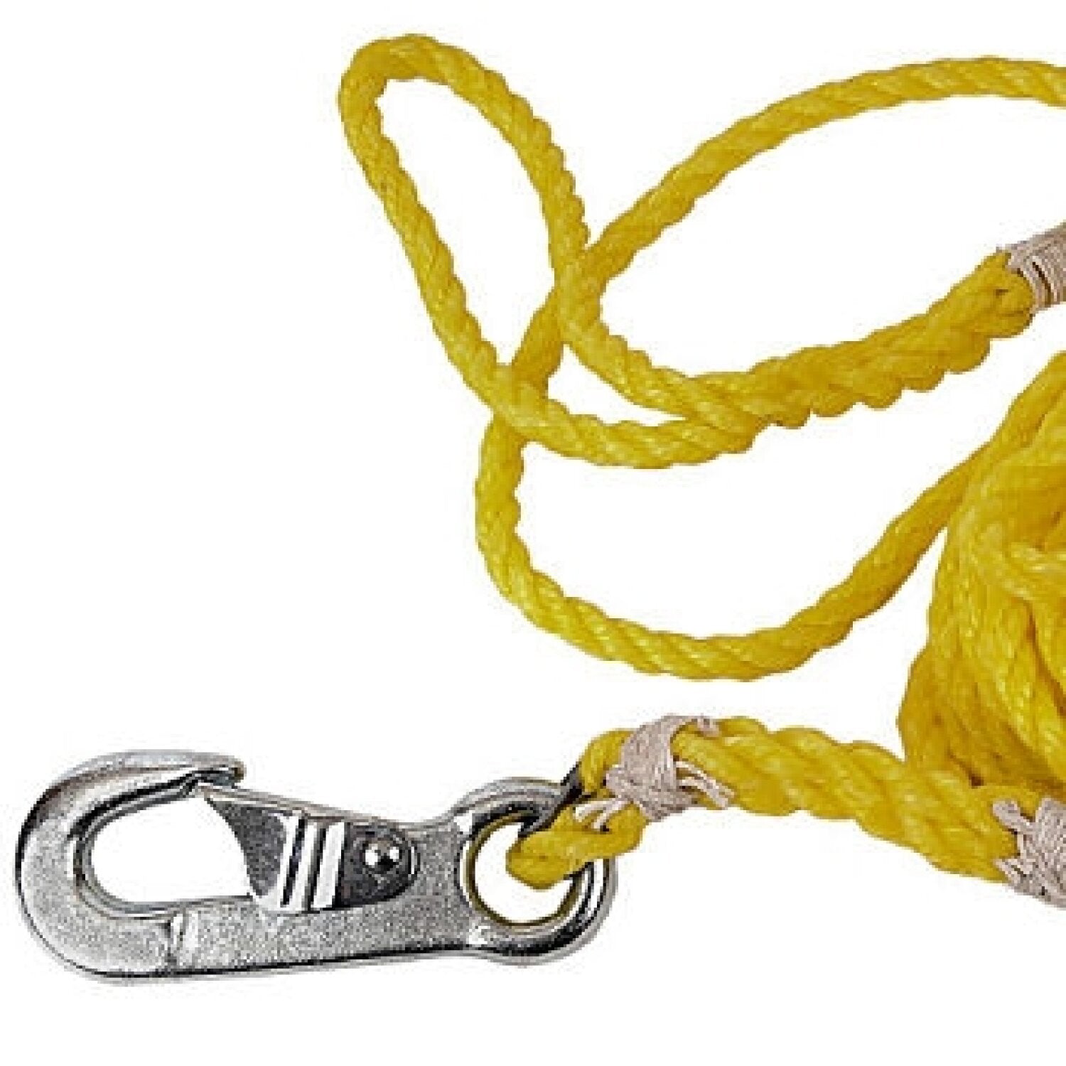 The GMP Lasher Towing Lanyard with snap hook connects to the ring on the towing bridle for pulling a lasher from ground level. A loop is spliced to one end of the 35 foot X 3/8 inch lanyard and a forged hook with safety snap is on the other.