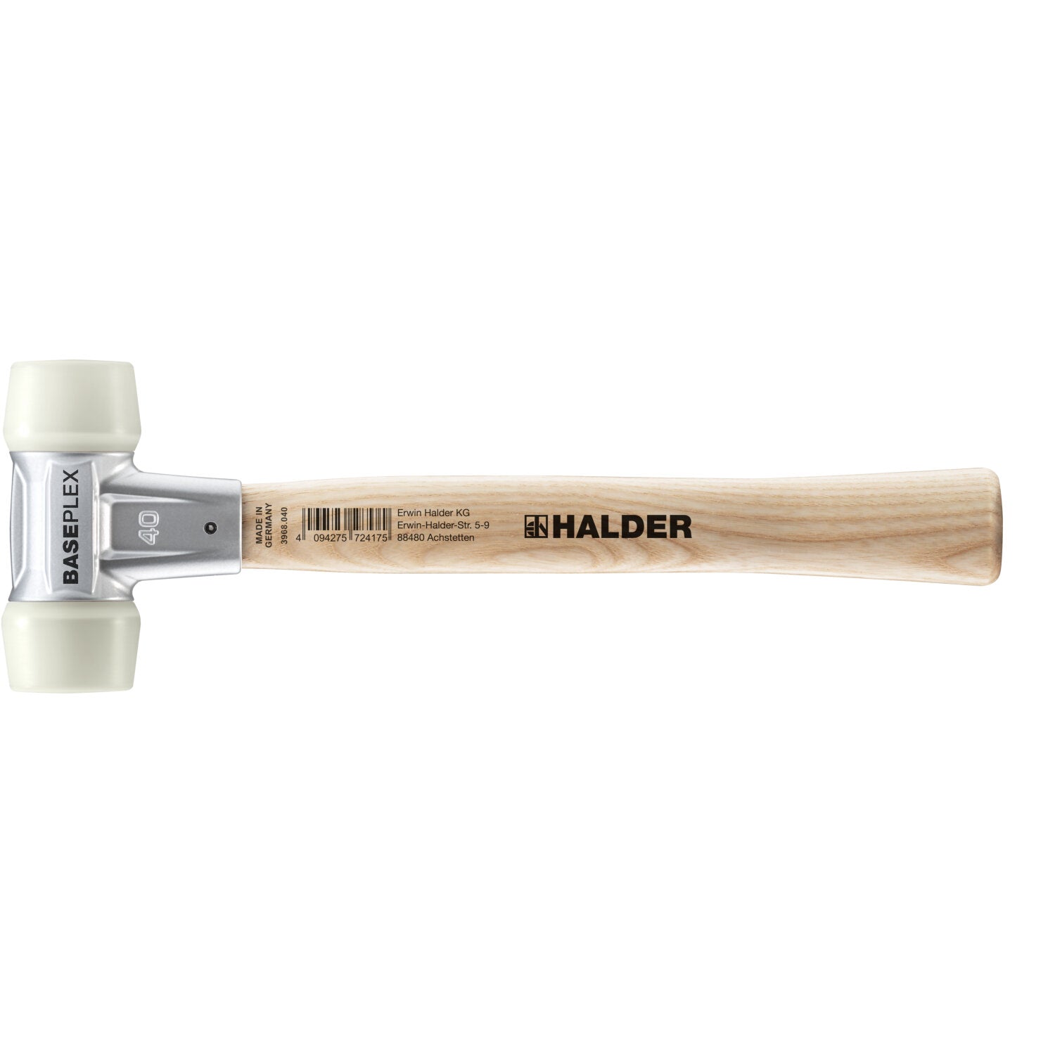 While representing the price entry model in the product line, the BASEPLEX undoubtedly lives up to Halder's high quality standards.The BASEPLEX soft-face mallet series 3908 is equipped with nylon inserts on either side. This white insert is slightly harder than the red cellulose acetate insert and is resistant to wear.Made of high-quality zinc die-cast, the body comes with an overstrike protector and a technically advanced holder for the inserts.The wooden handle is ergonomic and varnished. The inserts and the handle are replaceable.This version is available in sizes ranging from D25mm to D50mm.