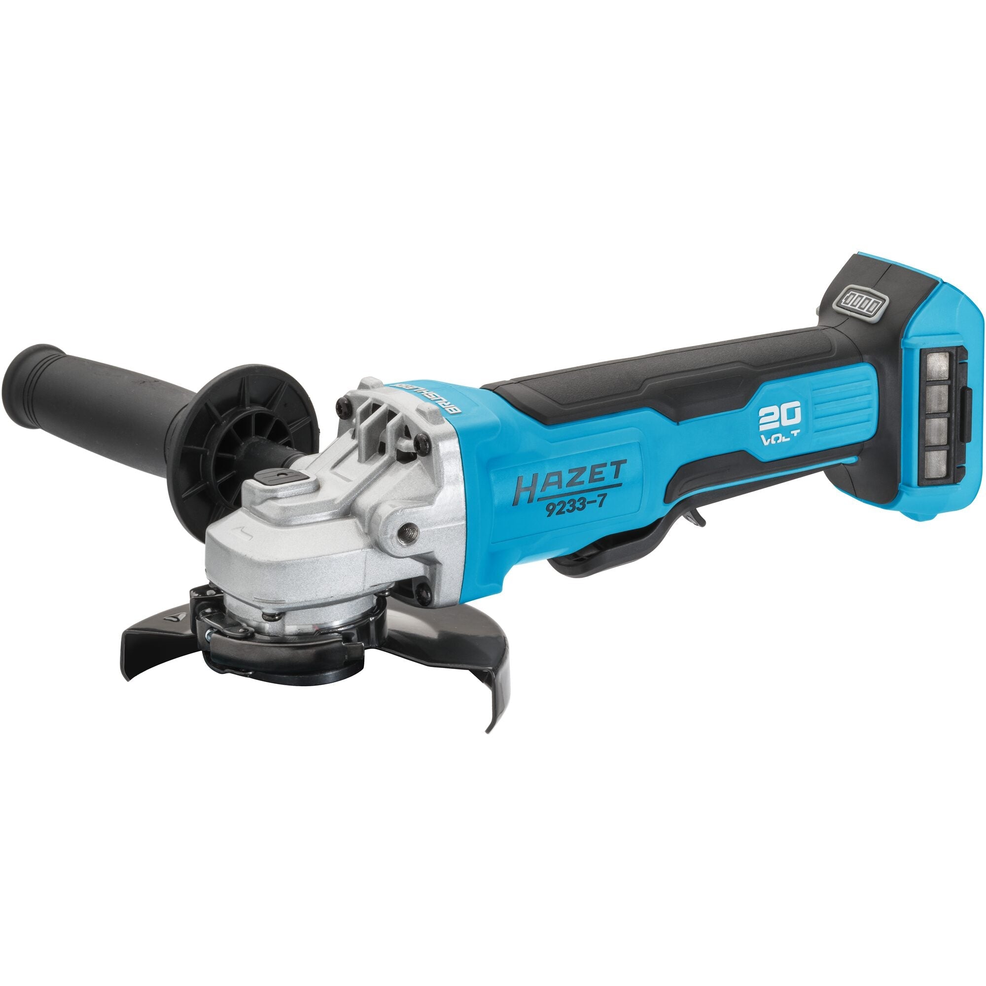 High efficiency thanks to brushless motor. Basic unit cordless right-angle grinder, without rechargeable battery. Compatible with HAZET rechargeable batteries 9212-02 and 9212-05. Ergonomic and compact housing design. Device stops if the speed drops sharply due to canting. Function against unintentional motor start when changing the battery. Mesh fabric protects motor from dirt. Motor stop 2 seconds after switch-off. Extremely flat head with low angle. Constant speed even during difficult work. Soft startup for greater comfort. Safety release lever. Lateral handle, to be used on left or right side. Including 1 protection cover each: for cut-off wheels, for rough grinding wheels. Quick adjustment of protection cover without tools. Spindle thread: M 14. Spindle lock. Weight with battery: 2.28 kg. Weight without battery: 1.53 kg. Vibration acceleration: 7.90 m/s2. Dimensions / length: 345.1 mm. Sound pressure level: 89 dB(A) Lp A. Revolutions per minute: 8000.