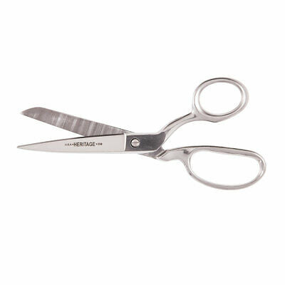 Offset handles allow for easy, straight cutting on flat surfaces. Perfect for general fabric, dressmakers, and production work. Heritage trimmers are known for holding an edge through continuous use. Hot drop forged, stainless steel. Power lock screw. 8 5/8'' overall length; 3'' cut length.