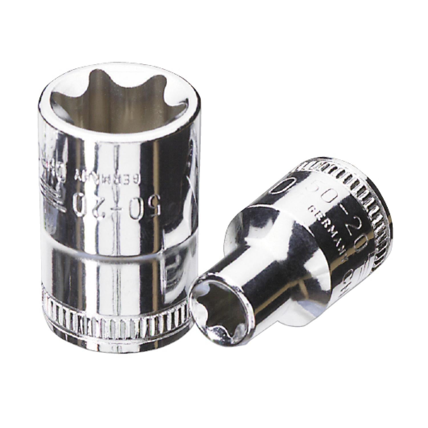 Chrome vanadium socket with ball retainer groove. Chrome plated, fully polished. For external TORX screws.