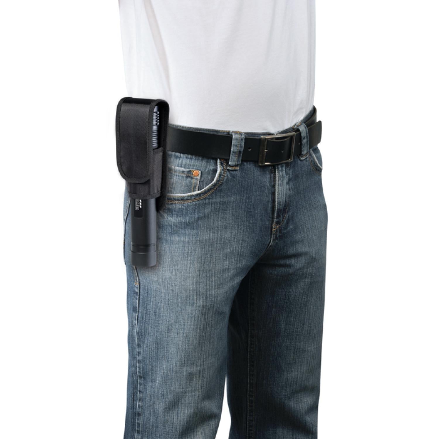 10W-LED-Torchlight. 10 watt Cree LED, high energy efficiency, extra long duration, zoom function, splash-proof, black anodized. Power mode 100 % / 900 LM, power safe mode 50% / 450 LM, stroboscope mode. Length 245 mm, head diameter 50 mm, weight incl. batteries (3x D-Cell) 800 g, batteries and belt pouch included.