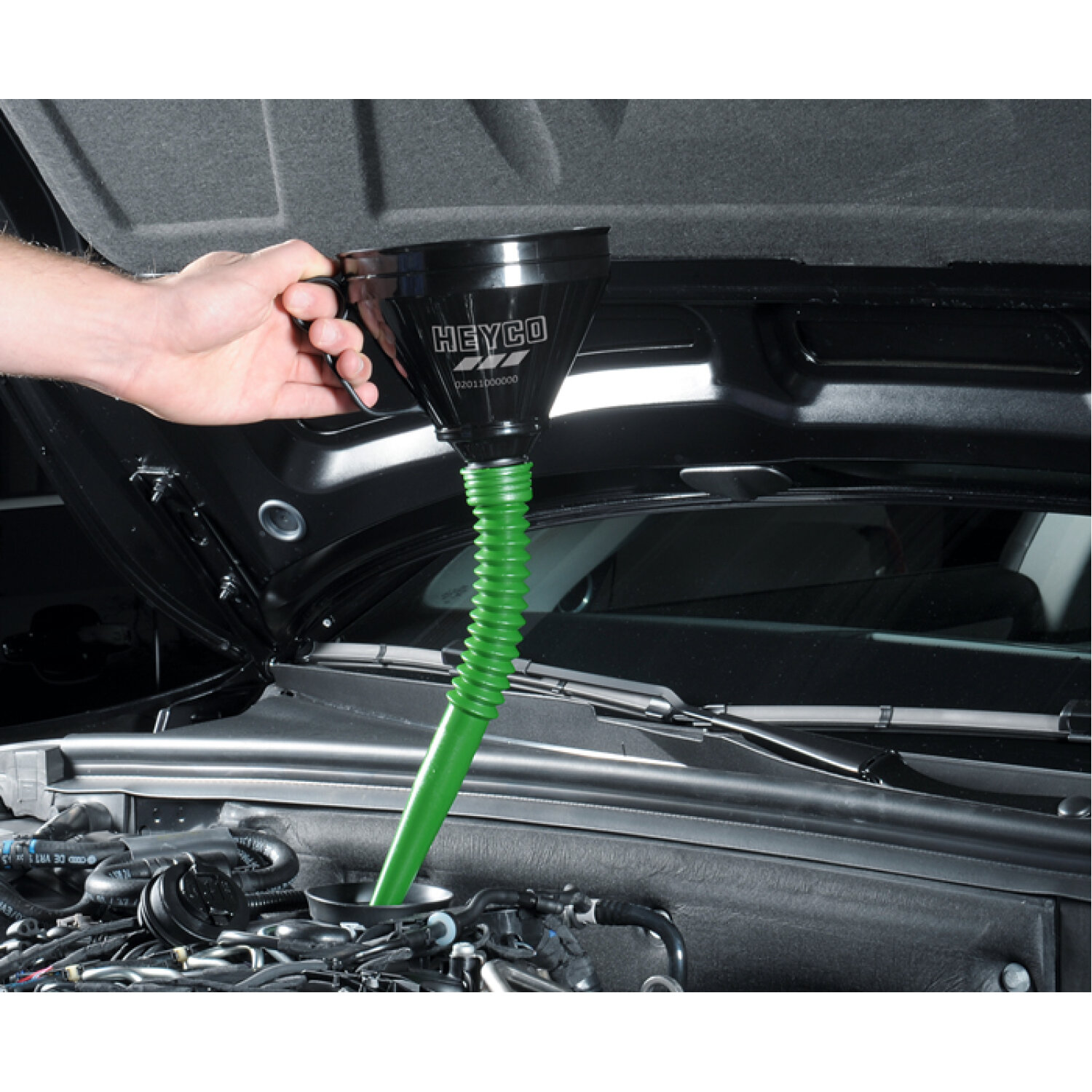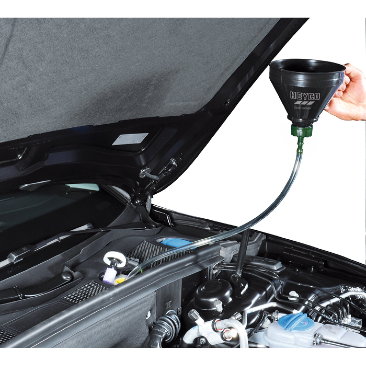 funnel made of Polypropylene, capacity 1,2 L, flexible spout, 340 mm, transparent hose for water, break fluid etc., 600 mm length, stainless steel sieve to protect , against pollution