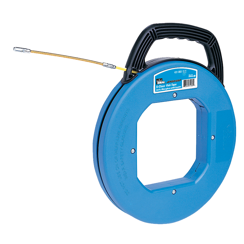 S-Class® Fiberglass Fish Tapes are non-conductive, and the best choice when working near live circuits. A high quality fiberglass core provides column strength for optimum pushing and pulling capability. Its round shape allows an omni-directional capability perfect for multiple bends, or bends that change planes.