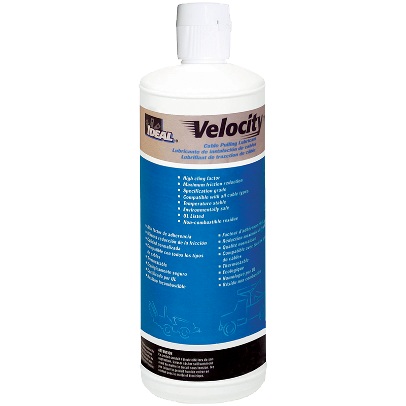IDEAL Velocity™ Non-toxic cable pulling lubricant in ivory translucent color is designed with high cling factor that permits maximum friction reduction. It is manufactured without fatty acids, which means it won't go rancid or breakdown in heat. It will also dry to a powder, thereby leaving wires free to be removed later with no damage to the jacket or conduit. No lubricant dissolver is needed, unlike some competitive brands. It offers temperature stability and is compatible with all popular cables. It is environmentally safe, and has a non-toxic, non-combustible residue, is non-flammable and non-corrosive. Specification grade lubricant comes in 1 qt squeeze bottle, 1-gallon bucket, and a 5-gallon bucket. Lubricant is UL listed.