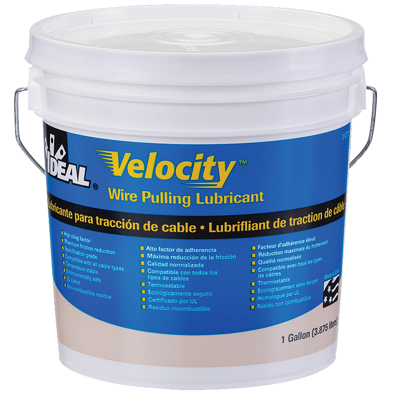 IDEAL Velocity™ Non-toxic cable pulling lubricant in ivory translucent color is designed with high cling factor that permits maximum friction reduction. It is manufactured without fatty acids, which means it won't go rancid or breakdown in heat. It will also dry to a powder, thereby leaving wires free to be removed later with no damage to the jacket or conduit. No lubricant dissolver is needed, unlike some competitive brands. It offers temperature stability and is compatible with all popular cables. It is environmentally safe, and has a non-toxic, non-combustible residue, is non-flammable and non-corrosive. Specification grade lubricant comes in 1 qt squeeze bottle, 1-gallon bucket, and a 5-gallon bucket. Lubricant is UL listed.