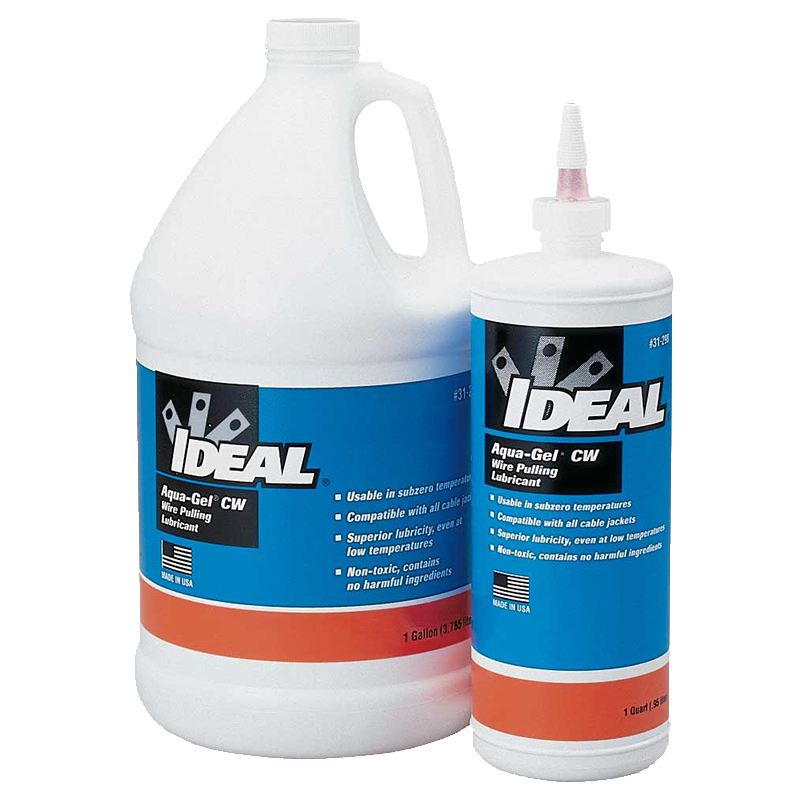 IDEAL Aqua-Gel® CW non-toxic cable pulling lubricant features the same excellent qualities as IDEAL Aqua-Gel®II, but with a lower temperature range for exterior use in cold weather conditions. It is polymer-based formula with a clear orange color that offers maximum tension reduction in high-stress electrical and communications cable-pulling operations. Clings to cable throughout long pulls and is well-suited for hand or poured applications. Lubricant dries to a semi-fluid film that won't clog conduit, and cleans up easily with soap/water. It remains temperature stable over a wide temperature range from-28°F to 190°F (-33°C to 88°C). It is acceptable with all cable types except composite rubber, and clings to cable throughout long pulls. It comes in a 1-quart squeeze bottle, 1-gallon bucket, and 5-gallon bucket. It is environmentally safe, non-toxic, non-flammable and non-corrosive for convenient use. For outdoor use only.