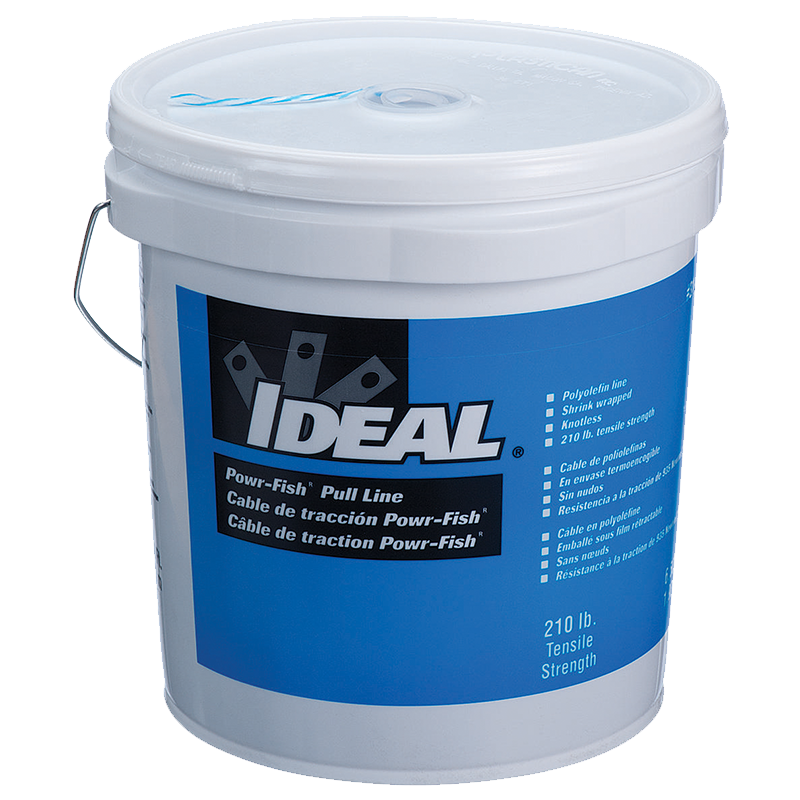 IDEAL Powr-Fish® heavy duty pull-line is white with blue tracer for easy identification. It is a continuous-fiber polyline that can be blown directly into conduit. It will not rot or mildew, and can be left in conduit for future use. Pull-line features convenient packaging in a bucket for 6,500 ft length with pre-punched top for easy access, and to keep the pull-line from spilling or tangling. The 500 ft length is available in a convenient canister. It is considered a heavy duty pull-line, and exhibits 210 lb tensile strength.